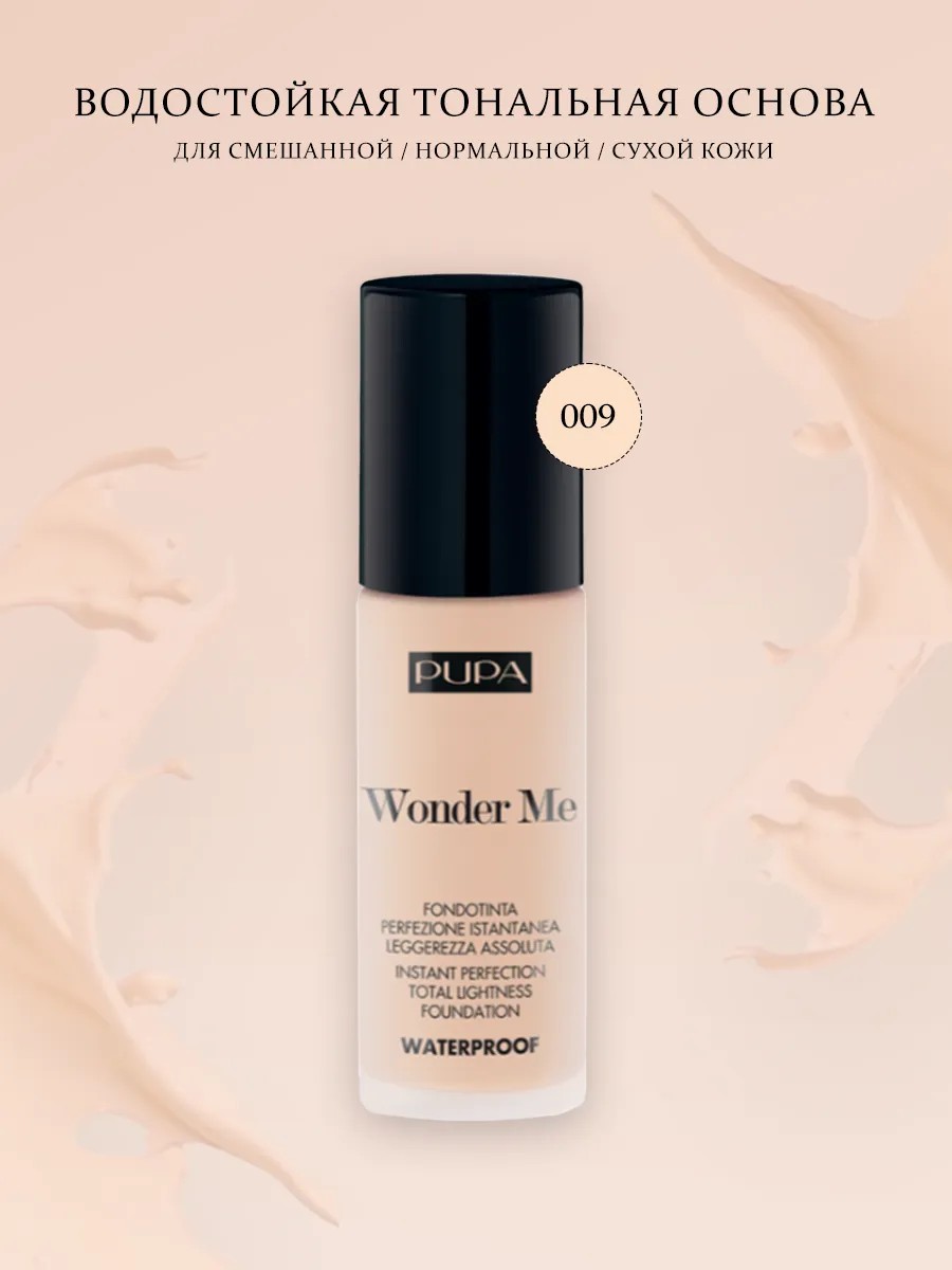 Тональная основа Pupa Wonder Me - косметика, сделанная по современным европейским стандартам, средство нового поколения. Потрясающая длительная устойчивость к любой влаге, безупречный макияж на весь день! Водостойкая основа от Пупа предназначена для смешанной, нормальной или сухой кожи. Обладает полуматовым финишем с эффектом натурального макияжа. Невесомая текстура не создает ощущение "маски" на лице, при этом сливается с кожей, адаптируется к цвету, не проваливаясь в мелкие морщинки. Секрет тонального крема Wonder Me заключается в особой микросеточке из ультрапластичных пленкообразующих агентов. После нанесения тональной основы, кожа гладкая и приятно увлажненная. Клинически тестированно, некомедогенно. Не тестируется на животных.