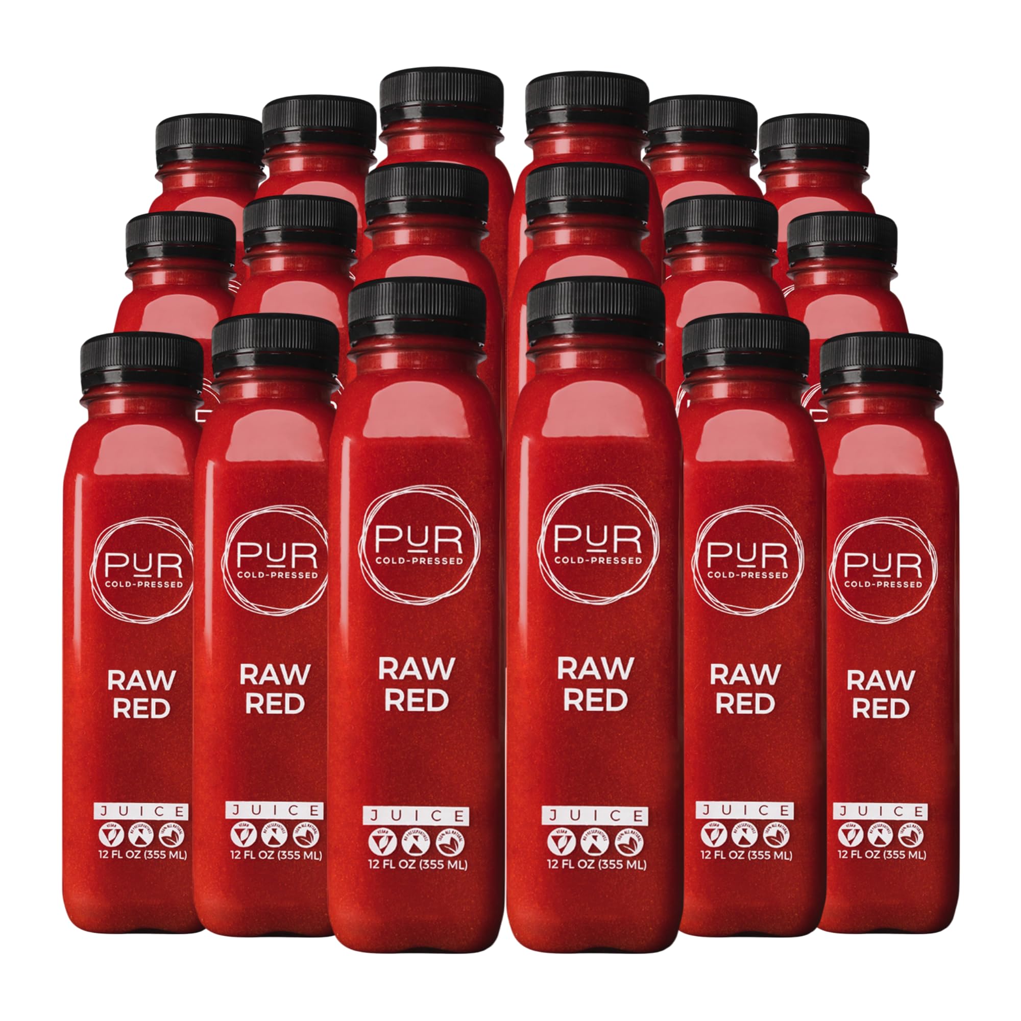 THE PUR WAY: Non-GMO, juiced at source, cold-pressed, and flash-frozen to retain nutrients. BPA-free bottles with 100 fresh-pressed juice—no concentrates or additives, just PUR goodness. HYDRATE REVITALIZE: Support your system after indulging, and give your tummy some love on bloating days. This juice pack is designed to help you feel lighter and more energized. WHAT'S IN THE PACK: 18x cold-pressed juices. Each one is packed with natural vitamins minerals to support wellness. Pre-portioned bottles for easy grab-and-drink convenience. RAW RED: All the benefits of beets, minus the earthy vibes. Juiced from fresh non-GMO apple, carrot, cucumber, beetroot, lemon ginger. A nourishing juice with natural sweetness. YOUR DAILY JUICE PACK: Got a favorite juice? PUR cold-pressed Daily Juice Packs let you indulge in your fave as often as you like! Available in a range of flavors, packed with goodness.