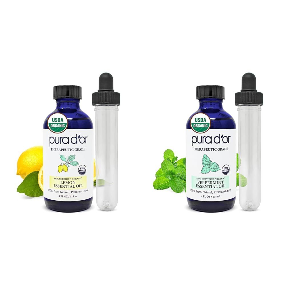 Refresh and rejuvenate with this bundle of PURA D'OR's lemon and peppermint organic essential oils. The lemon oil's citrusy scent comes from steam distillation of organic lemons. Its cleansing properties make it useful around the home and in personal care. Peppermint oil combines watermint and spearmint for an invigorating, minty aroma that opens nasal passages for clear breathing. Use lemon oil as a natural cleaner and degreaser in your home. A few drops in the laundry can remove stains without harsh chemicals. Add it to cleaning sprays or soaps to cut grease in the kitchen and bathroom. For personal care, it removes residue from hair and balances oily skin. Peppermint oil boosts energy and focus when diffused. It soothes skin irritation and dry scalps too. Together, these therapeutic grade, USDA certified organic, pure essential oils complement each other. The lemon cleanses while the peppermint invigorates your mind and senses. They create a refreshing environment, whether diffusing through your home or using topically. Give your home and body the uplifting wellness boost it deserves.