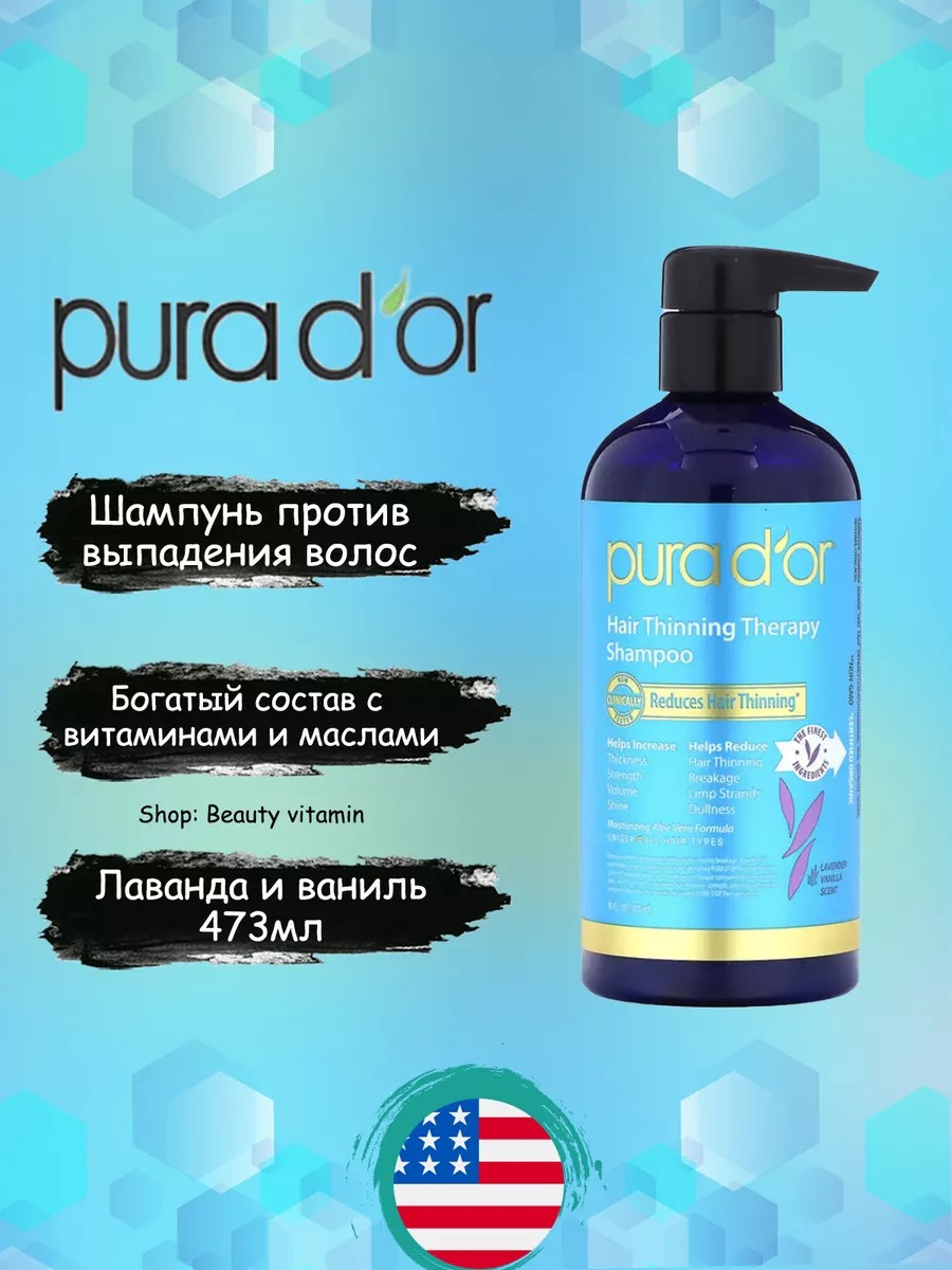 Шампунь против выпадения волос от PURA D'OR — это лидер продаж среди оригинальных средств, созданных для борьбы с выпадением волос, обладающий также многими другими полезными свойствами, что было доказано клиническими испытаниями. Эта многозадачная растительная формула премиального качества помогает увеличить объем, сияние, густоту и силу волос, бороться с выпадением*, тусклостью, ломкостью и ослабшими прядями. Эта мощная смесь предлагает полезные свойства органических ингредиентов премиального качества, чтобы поддержать здоровье волос, и не содержит вредных химических веществ. В ключевые натуральные ингредиенты входят масло амлы, аргановое масло, семена черного тмина, биотин, никотиновая кислота, розмариновое масло, сереноя, зеленый чай и наша эксклюзивная растительная смесь, которые действуют совместно, чтобы укреплять и питать, а также бороться с выпадением волос, связанным с их ломкостью. Улучшает густоту, силу, объем, блеск. Увлажняющая формула с алоэ вера. Подходит для всех типов волос.