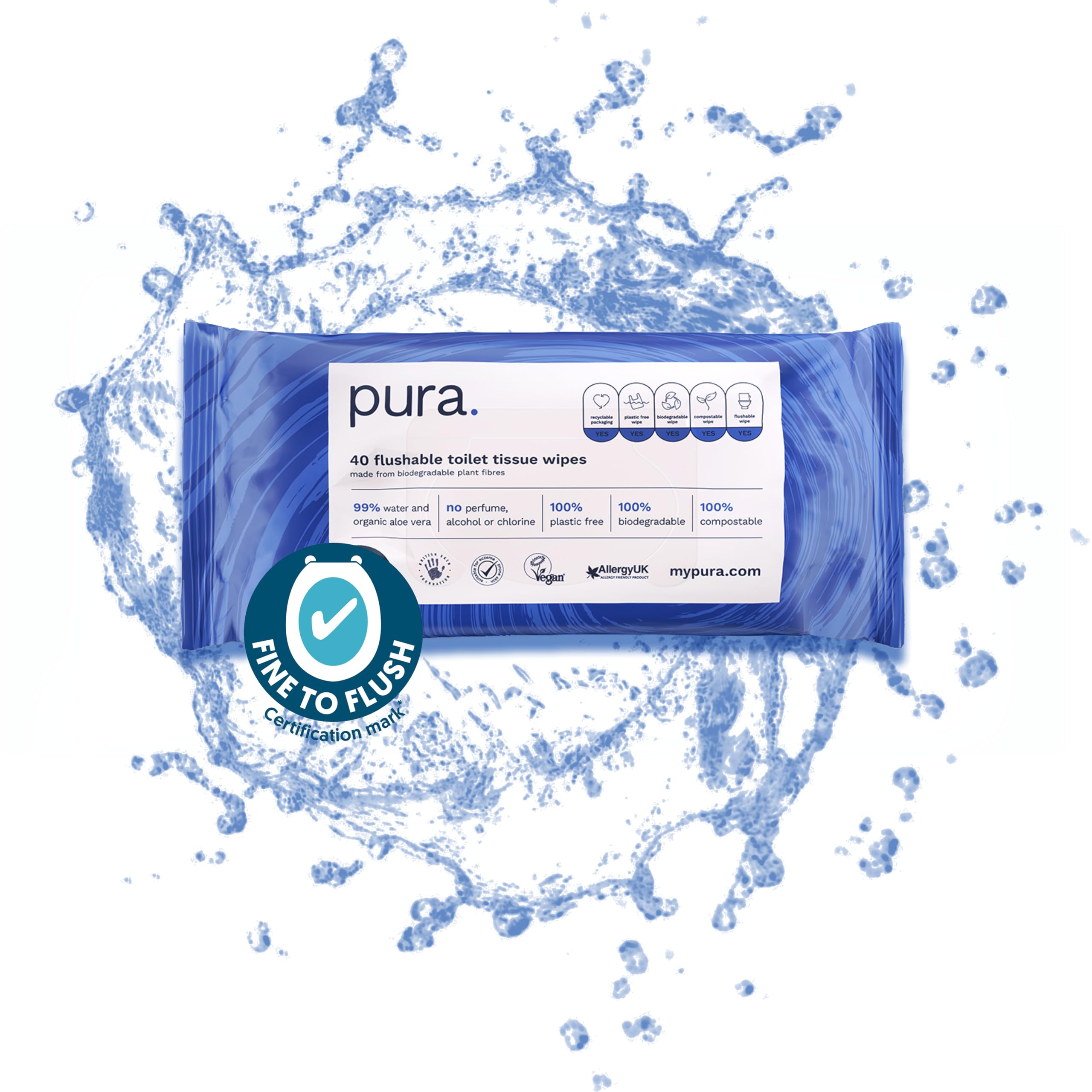 Most towels cannot be washed down safely.They contain plastic, so it can take up to 100 years for them to be biodegraded, which leads to fat mountains in the sewage system.The 100 % plastic -free, biodegradable toilet paper towels from Pura are accredited by Water UK as ""Fine to Flush"" so that you can rely on the fact that you dissolve in the water like a toilet paper, but feel softer on your buttocks.Small company, big ideas!Pura was not born in a meeting room, but in the house of the parents Guy and Abi Fennell from Cheshire after learning that 90 % of the British wipes contain environmentally harmful plastic and that damage to the sewer.Our mission is to make eco available for everyone with affordable, high -quality and environmentally friendly products.The world needs a big change.If we act now, we can move something!B means better business pura was officially recognized by B Corp as a positive force!What exactly does that mean?In short, B Corps are companies that present people and the environment with profit, just like Pura.All start-ups spend 12 months in the pending status, so it takes a while before we get full certification.If we do this, we will join a like -minded community of global pioneer, including well -known names such as Ben and Jerry's.See how we grow into a company that uses the power of the business to build a better world.Frequently asked Questions?Can I use PURA toilet paper towels with a sewage pit or chopping toilet?While pura toilet paper towels can easily be rinsed in systems that are connected to the main sewer system, we do not recommend the use for systems with sewage pits or macerators.How sustainable are Pura wet wipes?There is no plastic in our towels!They are simply made from biodegradable and compostable plant fibers, with 99 % water and organic aloe vera.They do not contain any perfume, no alcohol and no chlorine. Ingredients / ingredients No chlorine, perfume or alcohol.From 99 % water, aqua, aloe barbadensis (aloe vera) leaf juice, glycerin, levulic acid, sodium levulinat, sodium benzoat, dinatrium co-cocoamphodiacetate, potassium sorbate, sodium chloride. Instructions Use: Use 1-2 wet wipes, then seal the pack to prevent the wet wipes from drying out!To keep the butt clean, healthy and environmentally friendly, wipe from front to back and simply rinse the towels used in the toilet and give a strong rash! Warnings Warning: Babies sometimes try to eat the towels, so keep them outside their reach to avoid risk of suffocation. More ideal for the whole family: from potty training for toddlers to adult popos.Keep them in your bathroom or use them for cleaning at camping or at festivals.Multi-accredited: Pura towels are certified by the British Skin Foundation, Allergy UK, Vegan Society, Cruelty-Free, Not Tested On Animals and the Soil Association.Good for the environment: Our towels are 100 percent plastic -free, biodegradable and compostable.Made from sustainable plant fibers in Great Britain and delivered in recyclable packaging.Popos keeps it healthy: freshen up and feel cleaner with our soft, gentle towels.Suitable for sensitive skin and affected by eczema, they are tested by pediatricians and dermatologically.They contain mild cleaning agents, soothing, pure organic aloe vera, 99 percent natural water and no perfume, alcohol or chlorine.Safe to rinse: Puras damp cloths are officially accredited by Water UK as ""Fine to Flush"".It is the only standard that you can trust.They crush with running water as well as toilet paper, so they do not cause constipation or fat mountains. Die meisten Tücher können nicht sicher die Toilette hinuntergespült werden. Sie enthalten Kunststoff, daher kann es bis zu 100 Jahre dauern, bis sie biologisch abgebaut sind, was zu Fettbergen in der Kanalisation führt. Die 100 % plastikfreien, biologisch abbaubaren Toilettenpapiertücher von Pura sind von Water UK als „Fine to Flush“ akkreditiert, sodass Sie sich darauf verlassen können, dass sie sich wie Klopapier im Wasser auflösen, sich aber weicher auf Ihrem Po anfühlen. Kleines Unternehmen, große Ideen! Pura wurde nicht in einem Sitzungssaal geboren, sondern im Haus der Eltern Guy und Abi Fennell aus Cheshire, nachdem sie erfahren hatten, dass 90 % der britischen Wischtücher umweltschädliches Plastik enthalten und kanalschädigende Fettberge verursachen können. Unsere Mission ist es, Öko für alle mit erschwinglichen, hochwertigen und umweltfreundlichen Produkten verfügbar zu machen. Die Welt braucht eine große Veränderung. Wenn wir jetzt handeln, können wir etwas bewegen! B bedeutet besseres Geschäft Pura wurde von B Corp offiziell als positive Kraft anerkannt! Was genau bedeutet das? Kurz gesagt, B Corps sind Unternehmen, die Mensch und Umwelt vor Profit stellen, genau wie Pura. Alle Start-ups verbringen 12 Monate im Pending-Status, also dauert es noch eine Weile, bis wir die vollständige Zertifizierung erhalten. Wenn wir das tun, werden wir einer gleichgesinnten Gemeinschaft globaler Vordenker beitreten, darunter bekannte Namen wie Ben und Jerrys. Sehen Sie, wie wir zu einem Unternehmen heranwachsen, das die Macht des Geschäfts nutzt, um eine bessere Welt aufzubauen. Häufig gestellte Fragen? Kann ich Pura Toilettenpapiertücher mit einer Klärgrube oder Zerhackertoilette verwenden? Während Pura-Toilettenpapier-Tücher problemlos in Systemen gespült werden können, die an die Hauptkanalisation angeschlossen sind, empfehlen wir die Verwendung für Systeme mit Klärgruben oder Mazeratoren nicht. Wie nachhaltig sind Pura Feuchttücher? In unseren Tüchern ist kein Plastik! Sie werden einfach aus biologisch abbaubaren und kompostierbaren Pflanzenfasern hergestellt, mit 99 % Wasser und Bio-Aloe Vera. Sie enthalten kein Parfüm, keinen Alkohol und kein Chlor. INHALTSSTOFFE / ZUTATEN Kein Chlor, Parfüm oder Alkohol. Aus 99 % Wasser, Aqua, Aloe Barbadensis (Aloe Vera) Blattsaft, Glycerin, Levulinsäure, Natriumlevulinat, Natriumbenzoat, Dinatrium-Coco