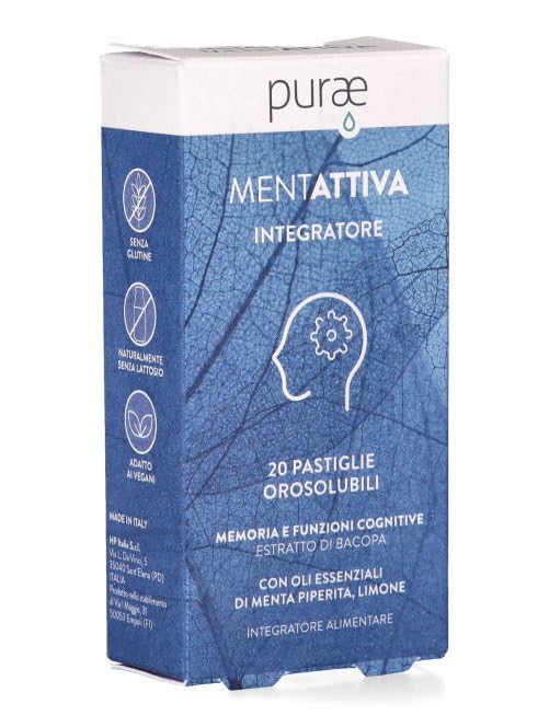 Purae mentattive Memory and Concentration Supplement with natural essential oils of peppermint, lemon, cajeput, juniper, and bacopa monnieri extract. An ideal nootropic formula to enhance long-term memory, mental clarity, and learning ability. Easy-to-take, gluten-free, lactose-free, and vegan-friendly orosoluble lozenges. Supports cognitive function, increases alertness, and reduces mental fatigue. Perfect for students, working professionals, and anyone looking to naturally boost focus and attention. INGREDIENTS Glucose syrup, sugar, peppermint (Mentha pepperis L., flower tops) essential oil, bacopa (Bacopa monnieri, herb) glyceric extract, lemon (Citrus citron L., fruit) essential oil, clove (Syzygium aromaticum L., flower buds) essential oil, cajeput (Malaleuca leucada endra L., leaves) essential oil, juniper berries (Juniperus communis L., seeds) essential oil, acidity regulator: citric acid. DISCLAIMER Supplements should not be considered as a substitute for a varied and balanced diet but should be used as part of a healthy lifestyle. Do not exceed the recommended dose. Keep out of reach of children under three years of age. See moreGluten-free, lactose-free, and vegan: suitable for those following specific diets without compromising on quality. Convenient orosoluble lozenges: easy to take, they melt slowly in the mouth for rapid absorption. Protective action: natural antioxidants help protect brain cells from oxidative stress. Improves concentration: boosts alertness and promotes mental clarity for greater productivity. Natural formula: essential oils of peppermint, lemon, cajeput, and juniper bacopa extract to support memory and concentration.Purae Mentattive - Complément mémoire et concentration 20 Plaquettes Orosolubles avec Huiles Essentielles et BacopaDESCRIPTION DU PRODUIT DESCRIPTION DU PRODUIT Complément de mémoire et de concentration Purae mentattive avec des huiles essentielles naturelles de menthe poivrée, citron, cajeput, genévrier et extrait de bacopa monniers. Formule nootropique idéale pour améliorer la mémoire à long terme, la brillance mentale et la capacité d'apprentissage. Pastilles orosolubles faciles à prendre, sans gluten, sans lactose et adaptées aux végétaliens. Prend en charge la fonction cognitive, augmente la vigilance et réduit la fatigue mentale. Parfait pour les étudiants, les travailleurs et ceux qui souhaitent renforcer la concentration et l'attention de manière naturelle. INGRÉDIENTS Sirop de glucose, sucre, menthe poivrée (mentha poivrée L., sommet avec fleurs) huile essentielle, bacopa (Bacopa Monnieri, herbe) extrait glycérique, citron (Citrus citron L., fruits) huile essentielle, girofle clous (Syzygium aromaticum L. gemme des fleurs) huile essentielle, cajeput (Malaleuca, leucada. endra L., feuilles) Huile essentielle, baies de genévrier (Juniperus communis L., graines) huile essentielle, correcteur d'acidité : acide citrique. CLAUSE DE NON-GARANTIE Les compléments ne doivent pas être considérés comme substituts à une alimentation variée et équilibrée mais doivent être utilisés dans le cadre d'un mode de vie sain. Respecter la dose recommandée. Tenir hors de portée des enfants de moins de trois ans. Voir plusSans gluten, sans lactose et végétalien : convient à ceux qui suivent des régimes spécifiques sans compromis sur la qualité. Pastilles Orosolubles confortables : faciles à prendre, fondent lentement dans la bouche pour une absorption rapide. Action protectrice : antioxydants naturels aident à protéger les cellules cérébrales du stress oxydatif. Améliore la concentration : stimule la vigilance et favorise la clarté mentale pour une plus grande productivité. Formula naturelle : huiles essentielles de menthe poivrée, citron, cajeput et genévrier extrait de bacopa pour soutenir la mémoire et la concentration.