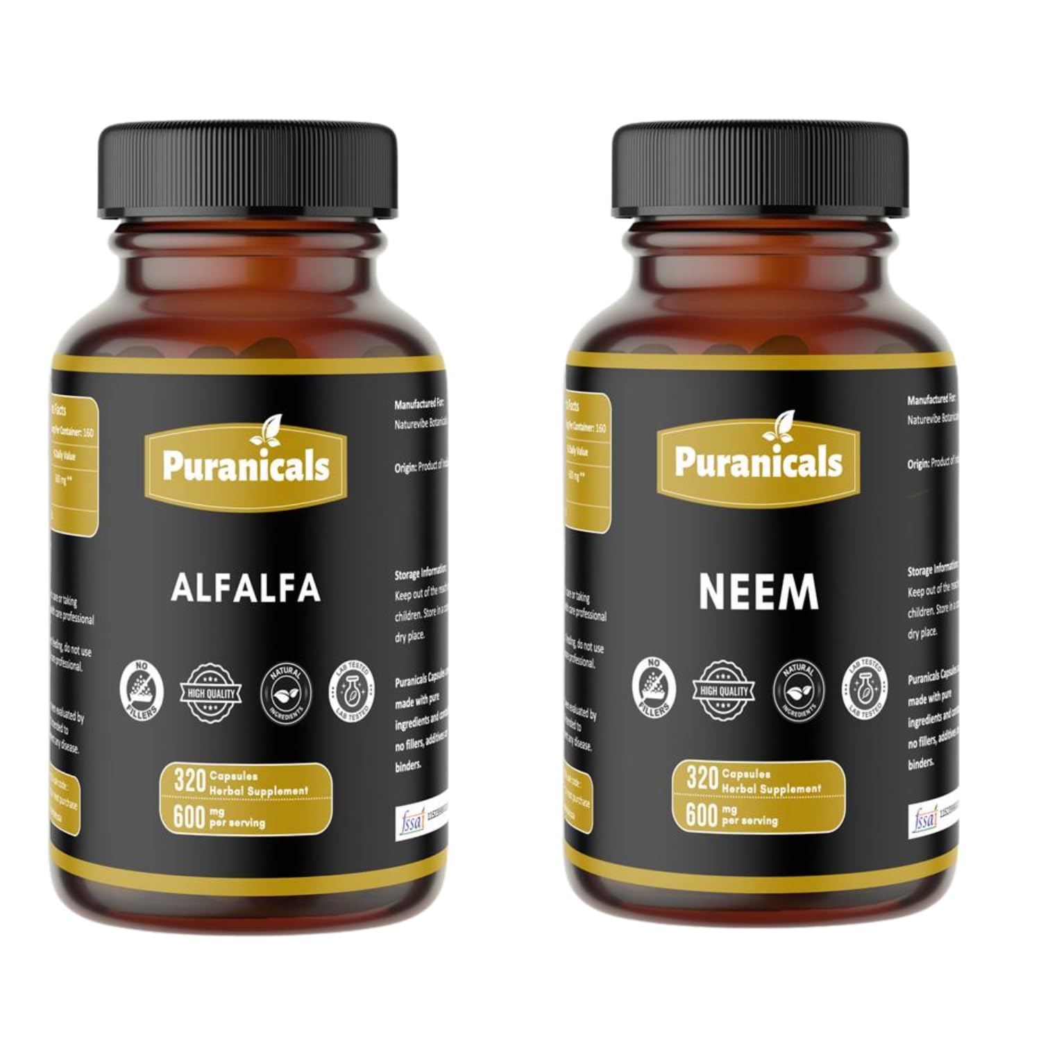 Puranicals Alfalfa 320 Capsules & Neem 320 Capsules Herbal Supplement Combo Pack | Easy Daily Use | Non-GMO Ingredients No Artificial Colors | Capsules Combo Pack