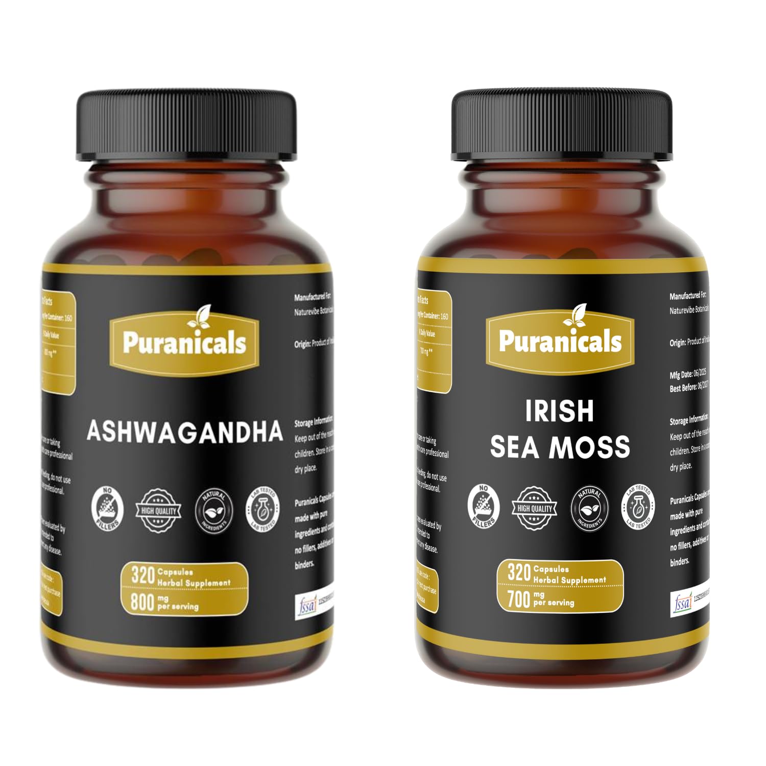 Puranicals Ashwagandha 320 Capsules & Irish Moss 320 Capsules Combo Herbal Dietary Supplement | Easy Daily Use | Non-GMO Ingredients No Artificial Colors | Capsules Combo Pack
