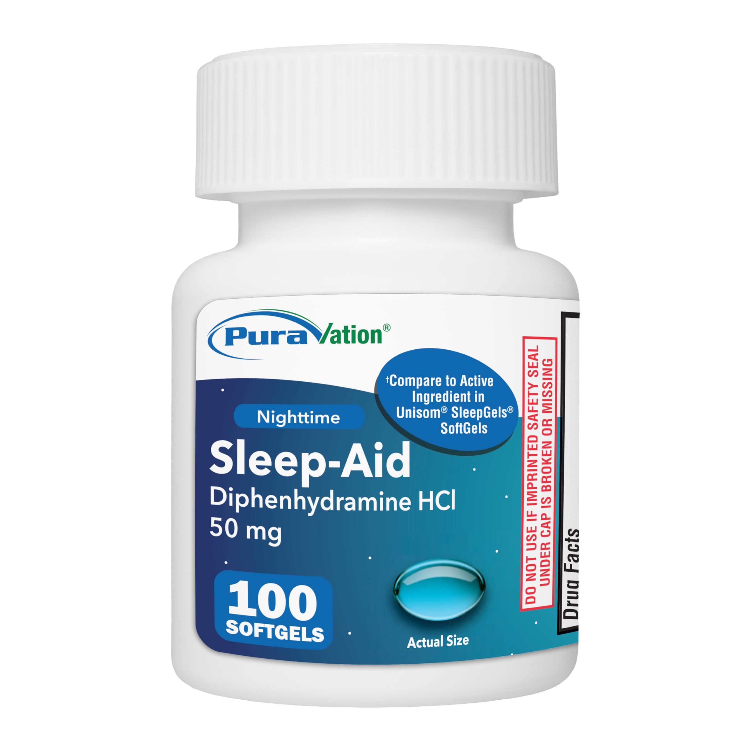 PuraVation Nighttime Sleep Aid 50mg softgels are a maximum strength, over-the-counter sleep aid formulated with 50mg of diphenhydramine HCl per softgel. Diphenhydramine HCl is a proven active ingredient that helps induce drowsiness for occasional bouts of nighttime sleeplessness. Each easy-to-swallow softgel delivers effective relief without the chalky aftertaste associated with other sleep medications. By helping you achieve a deeper, more restorative sleep, PuraVation Nighttime Sleep Aid allows your body to recharge naturally so you wake feeling refreshed. For occasional lack of sleep, these potent softgels may help you sleep through the night.