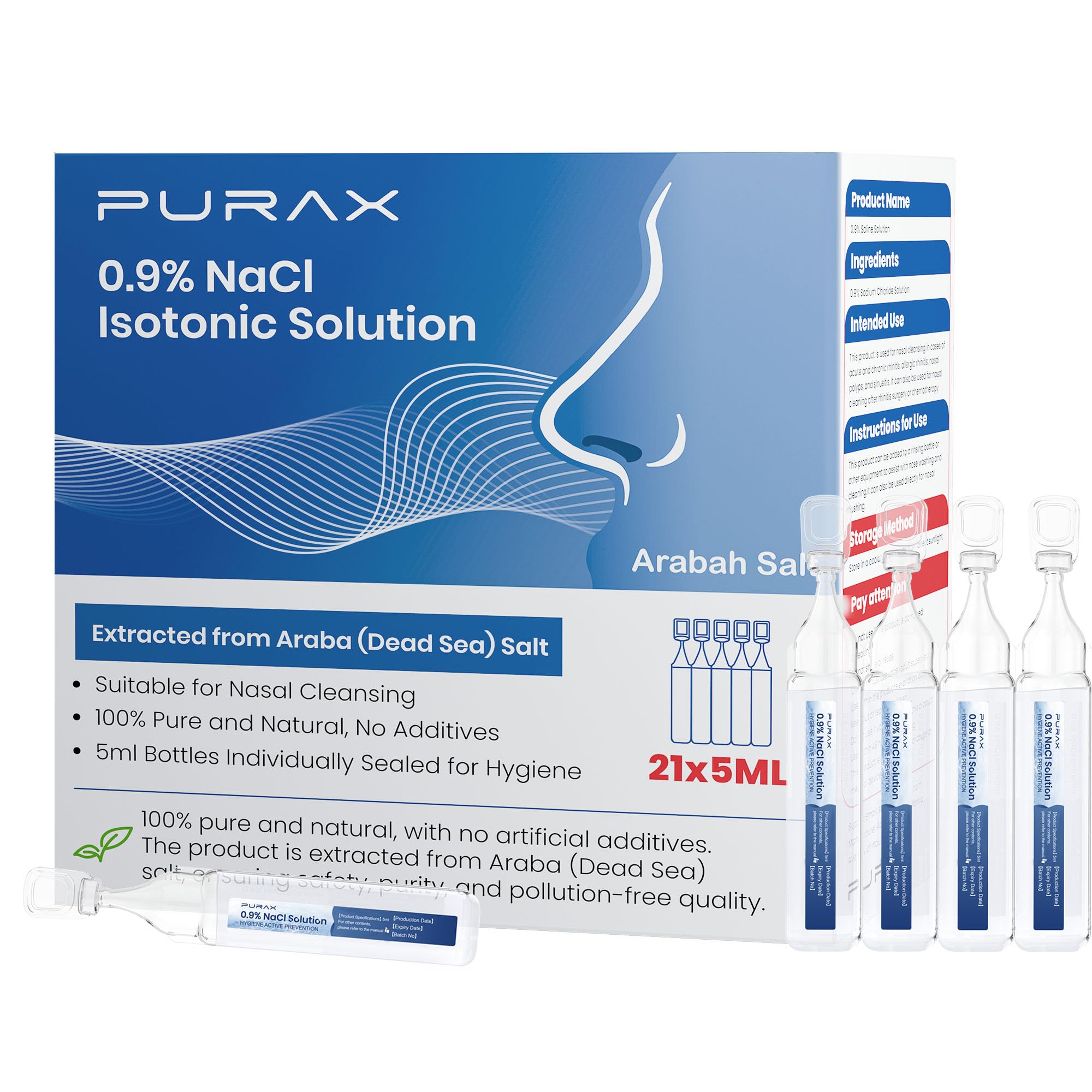 Multi-Situation Use - Individually sealed and ready to use immediately—no mixing required. Its compact size makes it easy to carry for whole-family care: combat office air conditioning dryness, get quick freshness during pollen season, moisturize during flights, or gently clean minor cuts and skin after activities. Portable Ready for Any Situation - This multi-purpose saline is compact and lightweight, making it easy to carry in a bag or pocket. Ideal for on-the-go nasal care, quick wound cleansing. Individually Sealed Hygienic - PURAX sodium chloride solution (0.9 ) comes in 5ml ampoules, with each box containing 21 bottles. Each bottle is sealed and sterile, making it convenient for users to access clean and safe solutions whenever needed. 100 Pure and Natural, No Additives - PURAX saline solution is always 100 pure and natural, with no artificial additives. The product is extracted from Araba (Dead Sea) salt, ensuring safety, purity, and pollution-free quality. Saline Nasal Cleansing More - PURAX saline solution is designed to help loosen the mucus in the nose and lungs, providing relief from nasal congestion and stuffiness. Its 0.9 isotonic formula matches your body's natural fluids, making it gentle enough for all ages.