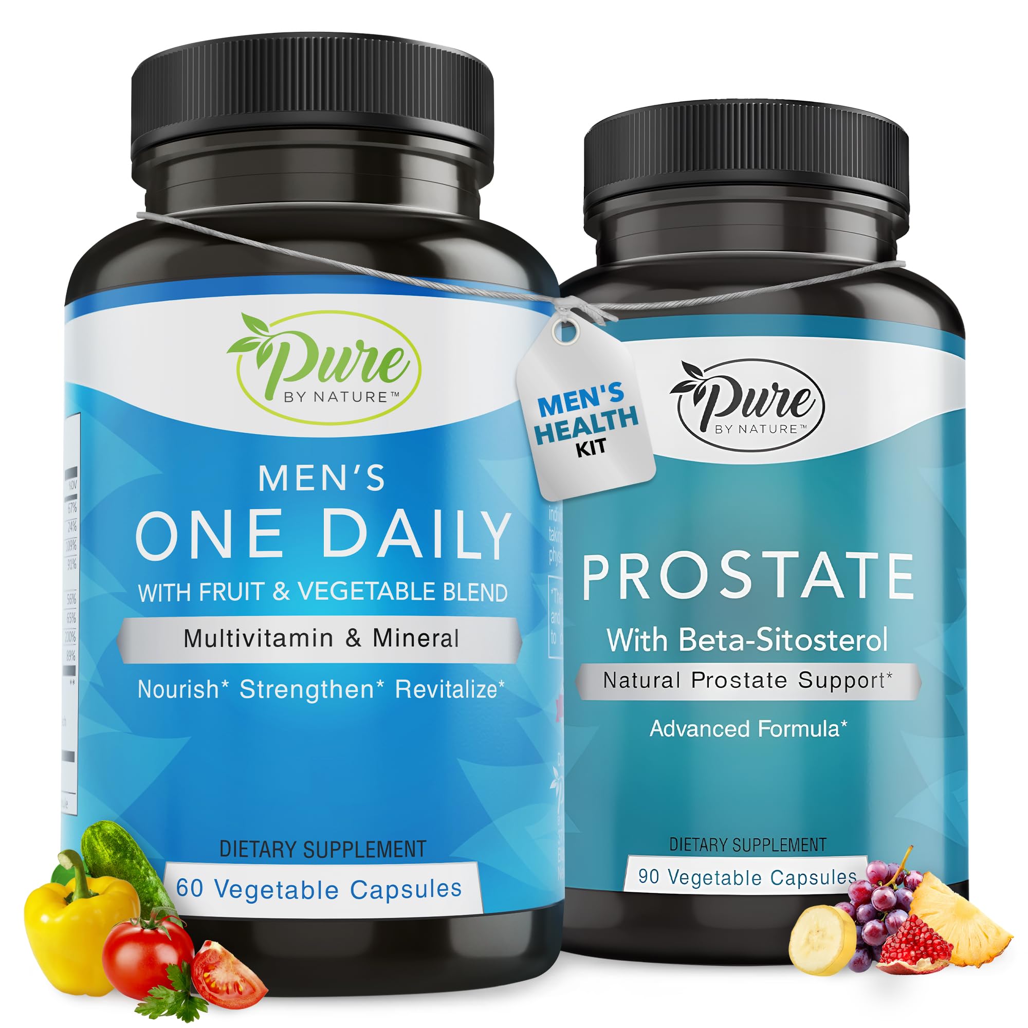 Our men's health bundle combines a powerful daily multivitamin for men with targeted prostate support to support overall wellness, energy, and vitality. With over 25 essential nutrients—including Vitamin B12, Vitamin C, Vitamin D3, and Vitamin B6—sourced from real foods, it may help fill nutritional gaps and support immune function. The beta sitosterol Prostate supplement includes plant sterols, zinc, quercetin, and grape seed extract to support prostate health and bladder control. Clean, non-GMO, and gluten-free, our pure for men formula is without artificial additives. Designed for men over 40, it also helps in restful sleep and hormonal balance. Whether you're feeling fatigued or dealing with nighttime disruptions, our bundle may help deliver convenient daily support. Ideal for those seeking reliable mens vitamins, supplements for men, and a complete wellness solution.Sleep Nighttime Comfort: Nighttime urgency can interrupt sleep, but our formula may help regulate hormones and reduce disruptions. With beta sitosterol for men, or zinc supplements for men, and calming nutrients like Vitamin D3, it doubles as a gentle sleep supplement for better rest. Clean Pure for Men: Our mens vitamins and prostate supplements are made with clean-label ingredients—non-GMO, gluten-free, and without artificial colors, fillers, or binders. Whether you're looking for vitamins and supplements for prostate or dependable male vitamins, our bundle is designed for purity and performance. Immune Energy Blend: Packed with antioxidants and essential nutrients like vitamin B6 (pyridoxine HCl), our blend may work to support immunity, metabolism, and energy. Ideal for active lifestyles or men who feel run down, our formula may keep your system supported throughout the day. Prostate Health Formula: Specially formulated for men over 40, our beta sitosterol prostate supplement blends plant sterols, zinc supplement, quercetin, and grape seed extract to support healthy prostate size and comfort. An ideal choice for those seeking natural prostate support and improved bladder control. Daily Multivitamin Support: Our One Daily multivitamin for men features 25 essential nutrients sourced from real foods like spinach, pomegranate, and carrot. With Vitamin B12, Vitamin C, and Vitamin D3, it may help fill nutritional gaps, support immune function, and enhance daily energy levels in one easy-to-take pure multivitamin capsule.