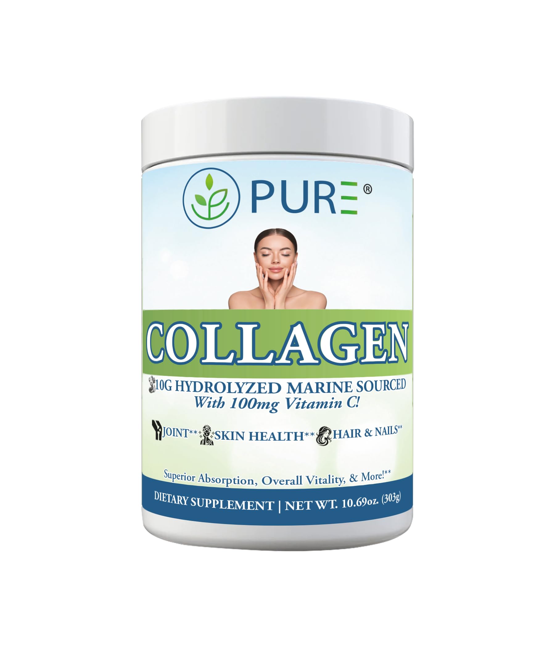 PURE Collagen 10g Premium Marine Collagen + 100mg Vitamin C 30 Servings 303 Grams 1 Month Supply Supports Healthy Lifestyles