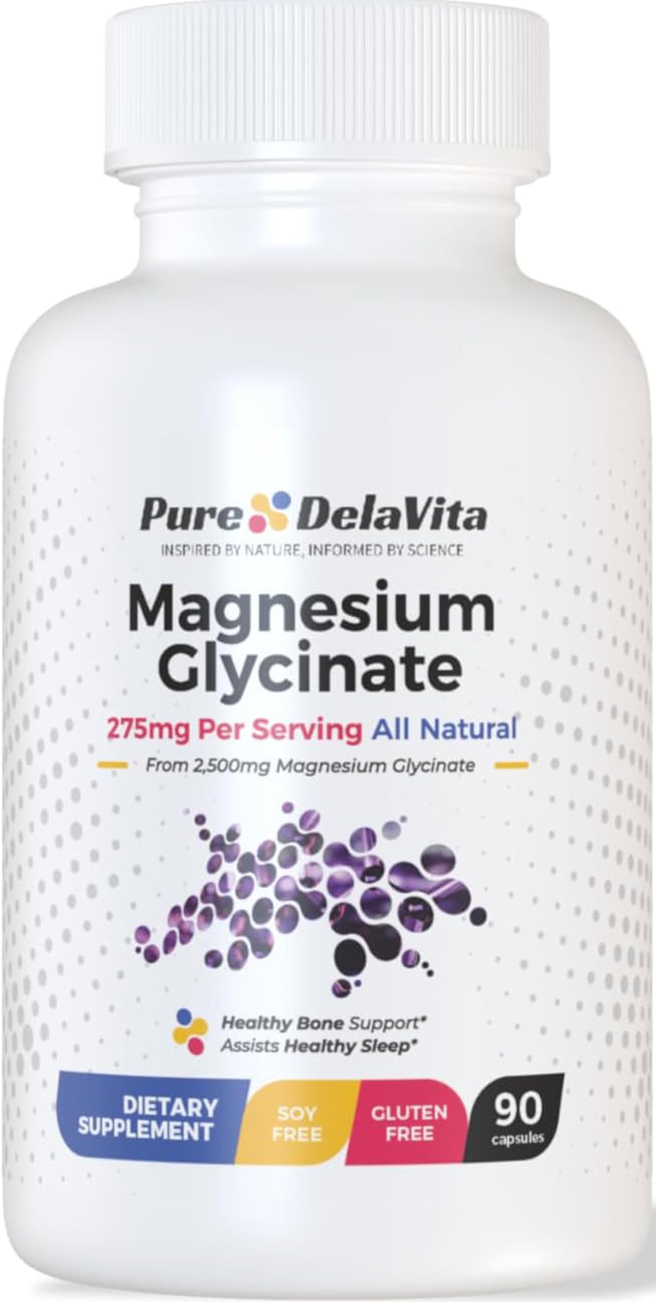 Pure DelaVita Magnesium Glycinate 275mg 90 Capsules High Absorption Non-GMO Gluten Free Supports Bone Health Relaxation and Sleep Dietary Supplement