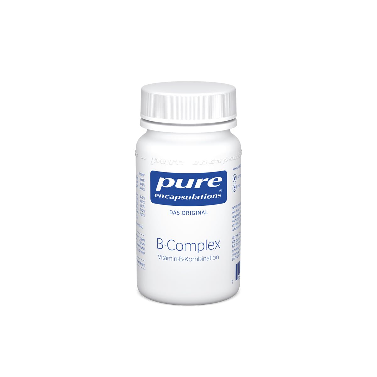 For daily care with all eight B vitamins, the eight B vitamins B1 (Thiamin), B2 (Riboflavin), B6 (pyridoxin), B12 (Cobalamin), Biotin, folic acid (folat), niacin and pantothenic acid are under the term ""B-Complex "summarized and complement each other in their functions.B-vitamins support us as catalysts in the metabolism and crank up the energy balance.In addition, vitamin B5 (pantothenic acid) contributes to a normal intellectual performance.Vitamins B2, B6 and B12 as well as folate, niacin and pantothenic acid help to reduce fatigue and exhaustion. Ingredients ingredients Ingredients: Filling fabric: microcrystalline, capsule: hydroxypropylmethylcell cellulose, niacinamide, calcium pantothenate, pyridoxal-5-phosphate, riboflavin-5-phosphate, thiamin HCL, calcium-l-methylfolate (metafolin ) Ylcobalamin Instructions 1 capsule per day for a meal. LEGAL NOTICE Notes: The specified recommended daily consumption amount must not be exceeded.Dietary supplements should not be used as a replacement for a varied and balanced diet.Keep out of reach of small children! Morefree of: All pure encapsulations products are free of wheat and gluten, egg, peanuts, trans fats and hardened fats, magnesium stearate, titanium dioxide, cover and shellac, artificial dyes, aromas and sweeteners as well as unnecessary binding, additional and preservatives.Biotin, niacin, pantothenic acid and the vitamins B1, B2, B6 and B12 contribute to a normal energy metabolism.Biotin, Niacin and the vitamins B1, B2, B6 and B12 contribute to a normal function of the nervous system.B vitamins in adapted dosage-ideal for long-term use.For daily care with all eight B vitamins.Für die tägliche Versorgung mit allen acht B-Vitaminen Die acht B-Vitamine B1 (Thiamin), B2 (Riboflavin), B6 (Pyridoxin), B12 (Cobalamin), Biotin, Folsäure (Folat), Niacin und Pantothensäure werden unter dem Begriff "B-Complex" zusammengefasst und ergänzen sich gegenseitig in ihren Funktionen. B-Vitamine unterstützen uns als Katalysatoren im Stoffwechsel und kurbeln den Energiehaushalt an. Zudem trägt Vitamin B5 (Pantothensäure) zu einer normalen geistigen Leistung bei. Die Vitamine B2, B6 und B12 sowie Folat, Niacin und Pantothensäure helfen Müdigkeit und Erschöpfung zu verringern. INHALTSSTOFFE ZUTATEN Zutaten: Füllstoff: mikrokristalline Cellulose, Kapsel: Hydroxypropylmethylcellulose, Niacinamid, Calciumpantothenat, Pyridoxal-5-Phosphat, Riboflavin-5-Phosphat, Thiamin HCl, Calcium-L-Methylfolat (Metafolin ), Biotin, Adenosylcobalamin, Methylcobalamin GEBRAUCHSANWEISUNG 1 Kapsel pro Tag zu einer Mahlzeit. RECHTLICHE HINWEISE Hinweise: Die angegebene empfohlene tägliche Verzehrsmenge darf nicht überschritten werden. Nahrungsergänzungsmittel sollten nicht als Ersatz für eine abwechslungsreiche und ausgewogene Ernährung verwendet werden. Außerhalb der Reichweite von kleinen Kindern lagern! MehrFrei von: Alle Pure Encapsulations Produkte sind frei von Weizen und Gluten, Ei, Erdnüssen, Transfetten und gehärteten Fetten, Magnesiumstearat, Titandioxid, Überzugsmittel und Schellack, künstlichen Farbstoffen, Aromen und Süßungsmitteln sowie unnötigen Bindemitteln, Zusatz- und Konservierungsstoffen. Biotin, Niacin, Pantothensäure sowie die Vitamine B1, B2, B6 und B12 tragen zu einem normalen Energiestoffwechsel bei. Biotin, Niacin sowie die Vitamine B1, B2, B6 und B12 tragen zu einer normalen Funktion des Nervensystems bei. B-Vitamine in angepasster Dosierung – ideal für den langfristigen Einsatz. Für die tägliche Versorgung mit allen acht B-Vitaminen.Pure Encapsulations - B-Complex - 60 Kapseln 12 g (1er Pack)