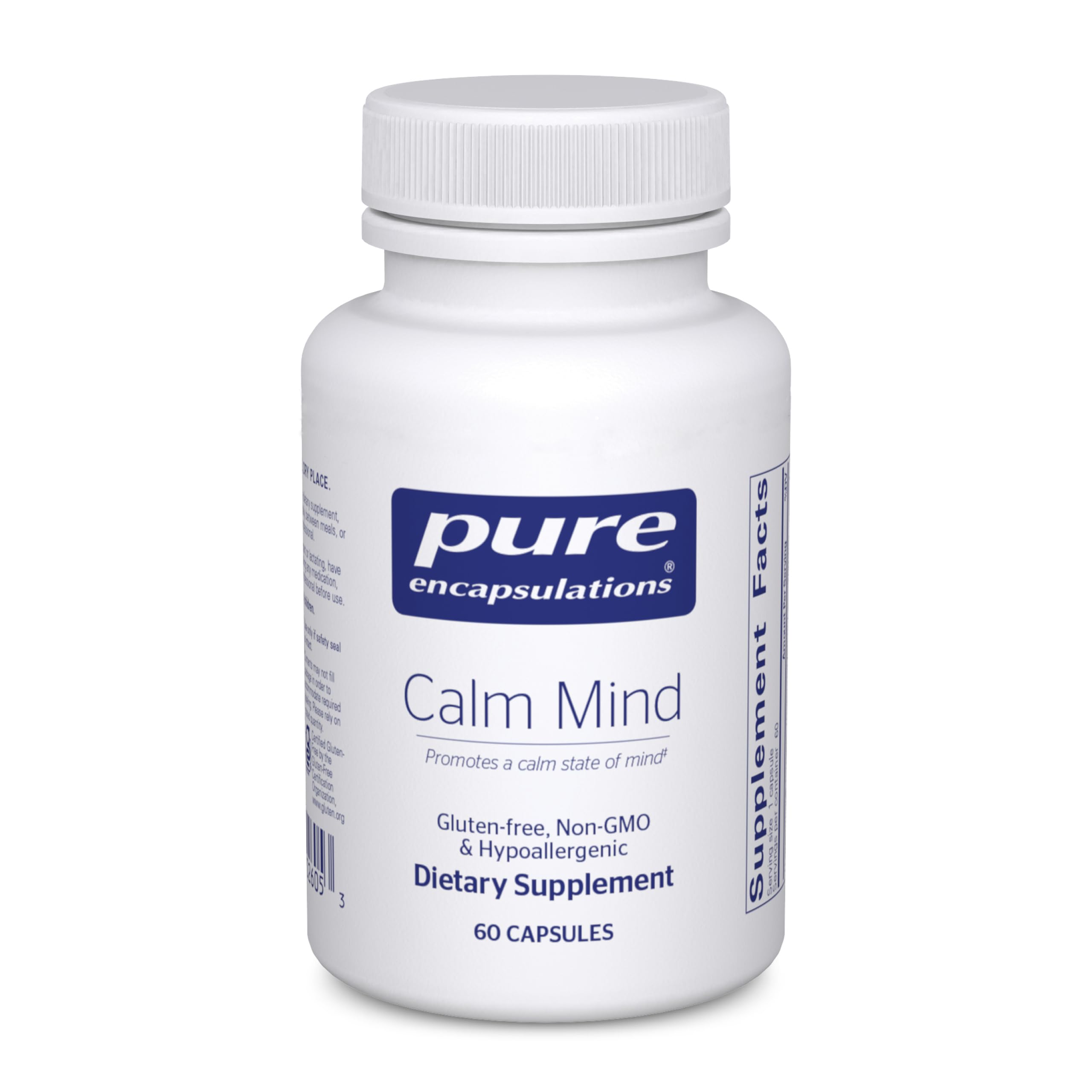 Pure Difference: What we leave out matters, too Pure Encapsulations products are free from common allergens, artificial or unnecessary ingredients, and GMOs. For Supporting Calmness: Take one capsule twice per day between meals, or as directed by a health professional . Supports Calm Mindset: This dietary supplement helps support calmness, restful nights, and a positive outlook for adults . Clinically Studied Saffron Extract: Features affron saffron extract combined with Theracurmin supplement, designed to support a sense of restfulness and calm . Calm Mind Benefits: Calm Mind Supplement by Pure Encapsulations supports relaxation and a positive outlook for daily health .