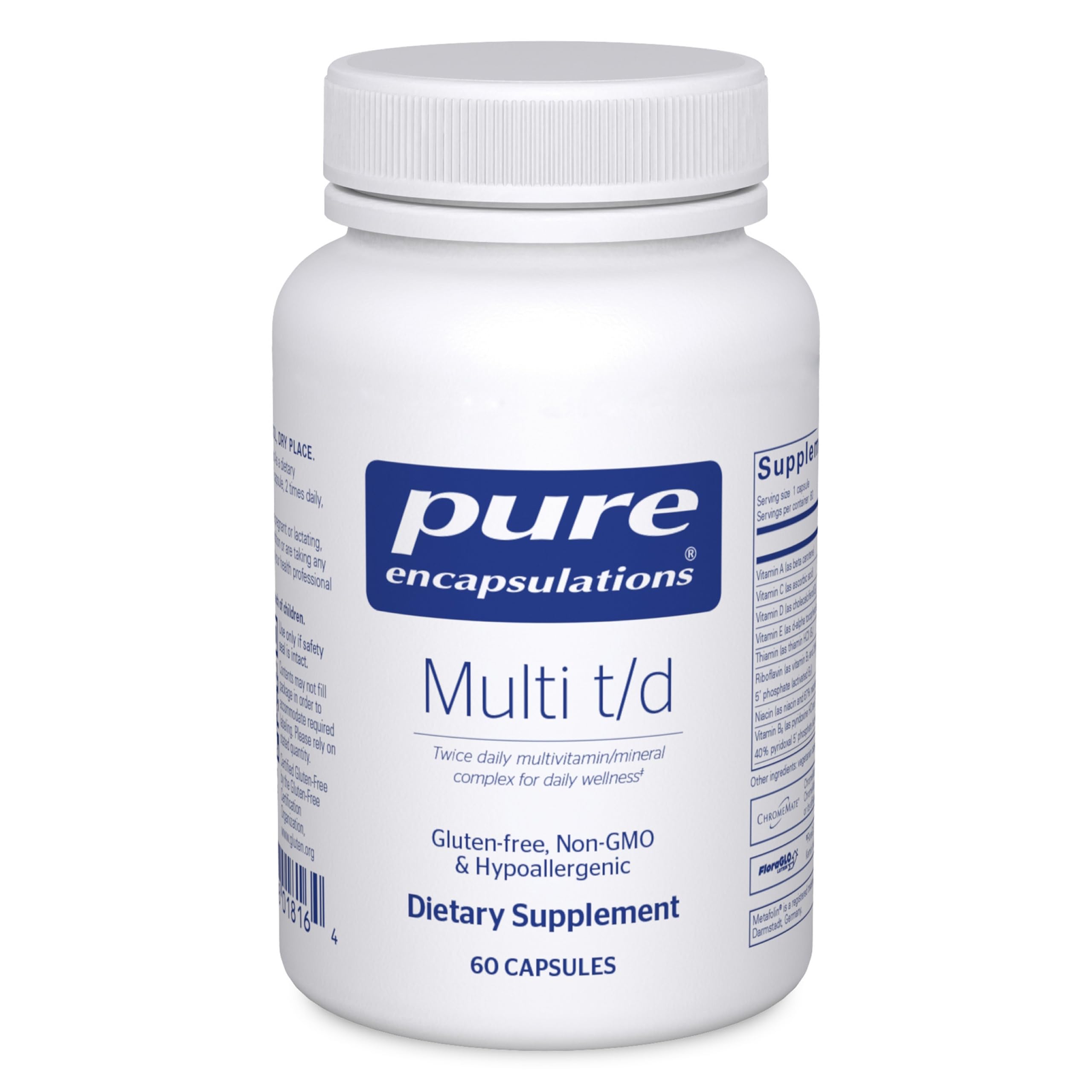Pure Difference: What we leave out matters, too Pure Encapsulations products are FREE FROM common allergens, artificial or unnecessary ingredients, and GMOs. 2-Per-Day Dose: As a dietary supplement, take 1 vitamins and minerals capsule, 2 times daily, with meals the formula is gluten free, vegetarian, and non-GMO. Optimal Nutrient Absorption: Twice-daily multivitamin and mineral complex with active vitamin cofactors and chelated minerals for optimal bioavailability . Antioxidants Immune Health: This formula supports immune health and provides antioxidants for cellular health . Essential Vitamins Minerals: Pure Encapsulations Multi T D is a vitamin-rich formula that supports daily wellness, as well as ocular, nervous system, and heart health .