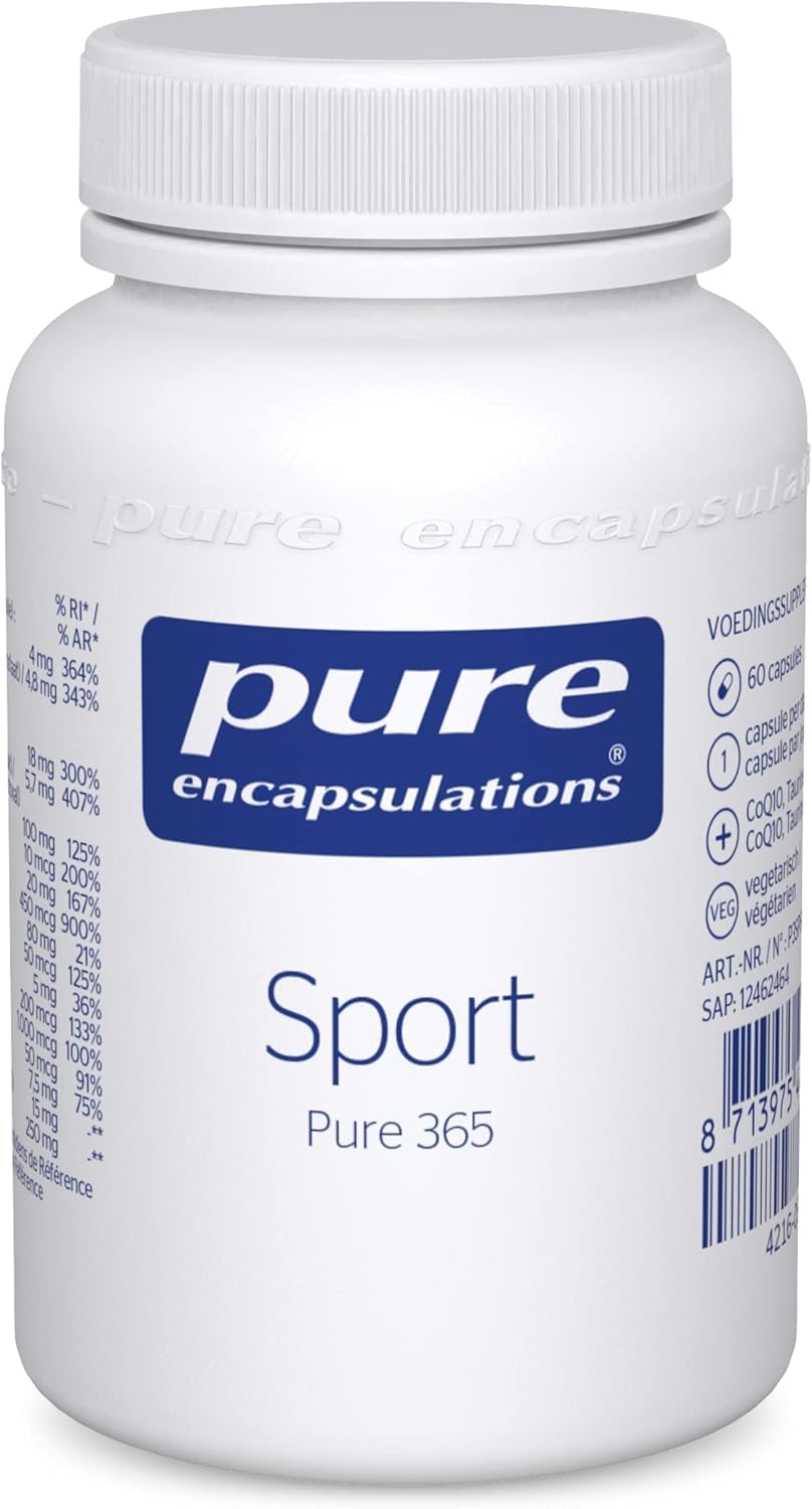 Pure Encapsulations Sport combines vitamins, minerals, and trace elements with coenzyme Q10 and taurine. The formula provides athletes with carefully selected micronutrients every day, helping to meet increased needs. Sport – Pure 365 contains organically bound micronutrients that are highly absorbed by the body. Pure Encapsulations micronutrients are lactose- and gluten-free, deliberately avoid artificial colors, contain no unnecessary additives, and require no release agents or film coatings. INGREDIENTS Ingredients: magnesium citrate, taurine, hydroxypropyl methylcellulose (capsule), ascorbic acid, D-alpha-tocopheryl succinate, ferric citrate, zinc citrate, calcium D-pantothenate, coenzyme, selenomethionine, L-ascorbyl 6-palmitate, potassium iodide, copper citrate, thiamine HCl, cholecalciferol, pyridoxal 5'-phosphate, sodium riboflavin 5'-phosphate, pyridoxine HCl, riboflavin, biotin, chromium picolinateFree From: All Pure Encapsulations products are free from wheat, eggs, tree nuts, peanuts, gluten, artificial colors, flavors, sweeteners, coatings and shellac, GMOs, unnecessary binders, fillers, and preservatives. Vitality Support: For increased vitality thanks to biotin, magnesium, iodine, calcium, iron, and vitamins B1, B2, B5, B6, and B12. Daily Micronutrients: For the daily supply of micronutrients essential for a balanced diet. Increased Needs: Helps meet increased needs during exercise for optimal support. Sports and Exercise: Designed for sports and exercise, supporting performance and recovery.Pure Encapsulations - Sport - Multivitamine voor Sporters met Vitaminen B, Vitamine C en Zink - 60 CapsulesDESCRIPTION DU PRODUIT DESCRIPTION DU PRODUIT Pure Encapsulations Sport combineert vitaminen, mineralen en oligo-elementen met co-enzym Q10 en taurine. De formule bezorgt de sporter elke dag zorgvuldig geselecteerde micronutriënten en helpt zo een verhoogde behoefte vervullen. Sport – Pure 365 bevat organisch gebonden micronutriënten die zeer goed door het lichaam worden opgenomen. Pure Encapsulations micronutriënten zijn lactose- en glutenvrij, vermijden bewust kunstmatige kleurstoffen, bevatten geen onnodige additieven en vereisen geen release agents of film coatings. INGRÉDIENTS Ingrediënten: magnesiumcitraat, taurine, hydroxy-propyl methylcellulose (capsule), ascorbinezuur, D-alfa-tocoferylwaterstofsuccinaat, ijzercitraat, zinkcitraat, calcium-D-pantothenaat, co-enzym, selenomethionine, L-ascorbyl 6-palmitaat, kaliumjodide, kopercitraat, thiamine HCl, cholecalciferol, pyridoxaal-5'-fosfaat, natriumriboflavine-5'-fosfaat, pyridoxine HCl, riboflavine, biotine, chroompicolinaatVrij Van: Alle producten van Pure Encapsulations zijn vrij van tarwe, eieren, boomnoten, pinda's, gluten, kunstmatige kleurstoffen, smaken, zoetstoffen, coatings en schellak, GGO's, onnodige bindmiddelen, vulstoffen en conserveermiddelen. Vitaliteit Ondersteuning: Voor meer vitaliteit dankzij biotine, magnesium, jodium, calcium, ijzer, en vitaminen B1, B2, B5, B6 en B12. Dagelijkse Micronutriënten: Voor de dagelijkse aanvoer van micronutriënten, essentieel voor een gebalanceerde voeding. Verhoogde Behoefte: Helpt aan een verhoogde behoefte bij sport voldoen, voor optimale ondersteuning. Sport en Beweging: Ontworpen voor sport en lichaamsbeweging, ondersteunt prestaties en herstel.