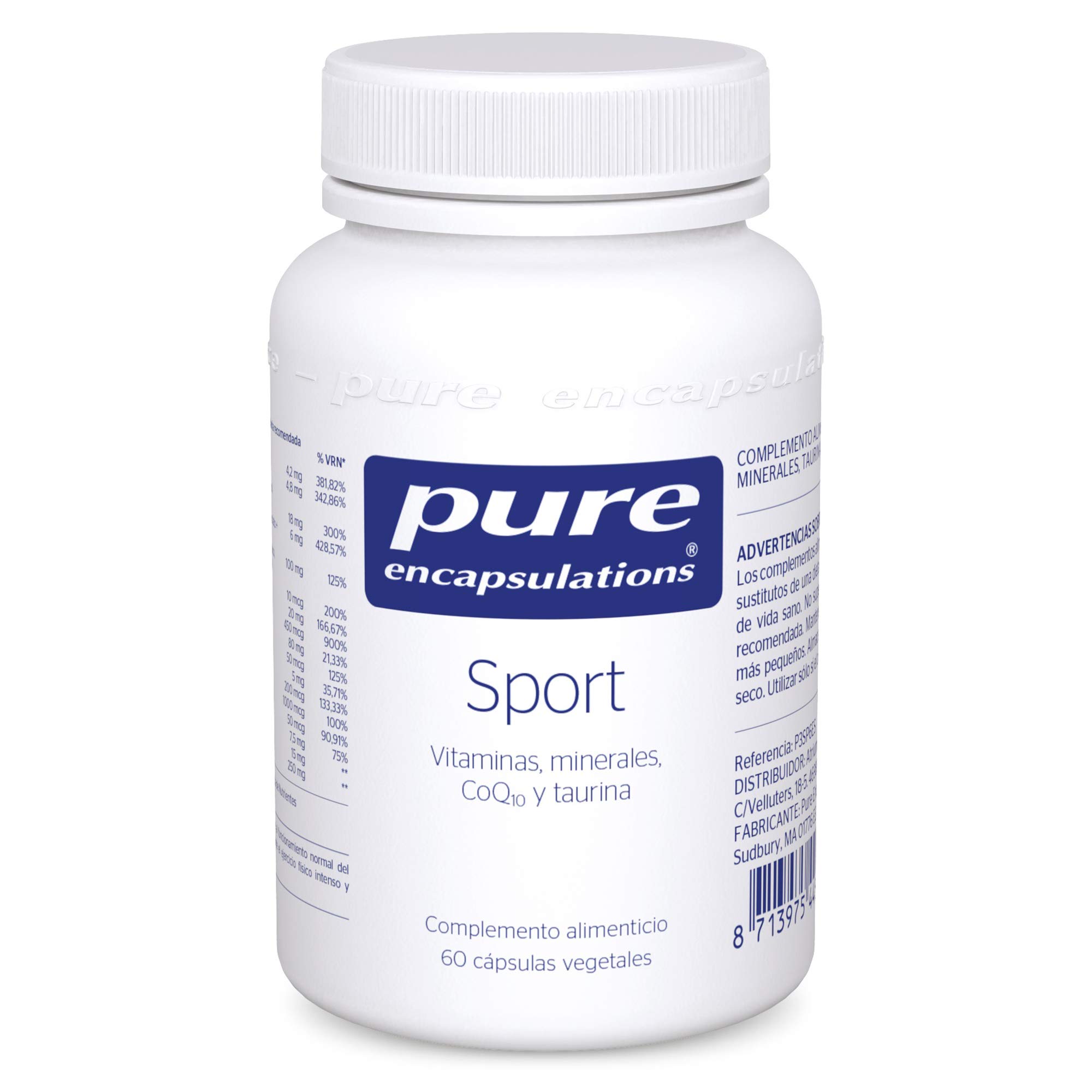 PURE ENCAPSULATIONS, Sport, with vitamin B12 in its active form obtained by fermenting corn dextrose. Helps in the formation of blood cells. Controls homocysteine levels. Maintains normal neurocognitive function. Reduces tiredness and fatigue. INGREDIENTS INGREDIENTS Magnesium citrate, taurine, coating agent (hydroxypropylmethylcellulose), vitamin C (L-ascorbic acid), vitamin E (D-alpha-tocopheryl acid succinate), zinc citrate, iron citrate, pantothenic acid (calcium D-pantothenate), coenzyme Q-10 (Kaneka Q10 ), L-selelene iomethionine, vitamin C (L-ascorbyl 6-palmitate), copper citrate, potassium iodide, vitamin B6 (pyridoxal 5'-phosphate), thiamine (thiamine hydrochloride), vitamin D (cholecalciferol), riboflavin (sodium riboflavin 5'-phosphate), vitamin B6 (pyridoxine hydrochloride), riboflavin (sodium riboflavin 5'-phosphate), vitamin B6 (boflavin hydrochloride), D-biotin, chromium picolinate. DIRECTIONS FOR USE Take 1 capsule daily between meals. If you are pregnant, breastfeeding, have a medical condition, or are taking medication, consult your healthcare professional before using this supplement. SAFETY WARNING Food supplements should not be used as a substitute for a balanced and varied diet and a healthy lifestyle. Do not exceed the expressly recommended daily dose. Keep out of reach of young children. Store closed in a cool, dry place. Use only if the safety lock is intact. Contains a moisture-proof device (caution: do not ingest). If you are pregnant, breastfeeding, have a medical condition, or are taking medication, consult your healthcare professional before using this supplement. See moreContains 60 vegetarian capsules. Suitable for vegetarians. Maintains normal neurocognitive function and reduces tiredness and fatigue. Helps with blood cell formation and controls homocysteine levels. PURE ENCAPSULATIONS, Sport, with vitamin B12 in its active form obtained by fermenting corn dextrose.PURE ENCAPSULATIONS Sport Vitamines, minéraux, CoQ10 et Taurine 60 Gélules VégétalesDESCRIPTION DU PRODUIT DESCRIPTION DU PRODUIT PURE ENCAPSULATIONS, Sport, avec vitamine B12 sous sa forme active obtenue par fermentation du dextrose du maïs. Aide à la formation des cellules sanguines. Contrôle les niveaux d'homocystéine Maintient une fonction neurocognitive normale. Réduit la fatigue et la fatigue. INGRÉDIENTS INGRÉDIENTS Citrate de magnésium, taurine, agent d'enrobage (hydroxypropylméthylcellulose), vitamine C (acide L-ascorbique), vitamine E (succinate acide D-alpha-tocophéryle), citrate de zinc, citrate de fer, acide pantothénique (D-pantothénate de calcium), coenzyme Q-10 (Kaneka Q10 ), L-sélélene iométhionine, vitamine C (6-palmitate de L-ascorbyle), citrate de cuivre, iodure de potassium, vitamine B6 (pyridoxal 5'-phosphate), thiamine (chlorhydrate de thiamine), vitamine D (cholécalciférol), riboflavine (riboflavine 5'-phosphate de sodium), vitamine B6 (chlorhydrate de pyridoxine), riboflavine (riboflavine 5'-phosphate de sodium), vitamine B6 (chlorhydrate Boflavine, D- biotine, picolinate de chrome. MODE D'EMPLOI MODE D'EMPLOI Prendre 1 capsule par jour entre les repas. Si vous êtes enceinte, allaitez, si vous avez des problèmes de santé ou prenez des médicaments, consultez votre professionnel de la santé avant d'utiliser ce complément. AVERTISSEMENT DE SÉCURITÉ Les compléments alimentaires ne doivent pas être utilisés comme substituts à une alimentation équilibrée et variée et à un mode de vie sain. Ne pas dépasser la dose quotidienne expressément recommandée. Tenir hors de portée des jeunes enfants. Conserver fermé dans un endroit frais et sec. Utiliser uniquement si le verrou de sécurité est intact. Contient un dispositif anti-humidité (attention: ne pas ingérer). Si vous êtes enceinte, allaitez, si vous avez des problèmes de santé ou prenez des médicaments, consultez votre professionnel de la santé avant d'utiliser ce complément. Voir plusContient 60 capsules végétales. Convient aux végétariens. Maintient une fonction neurocognitive normale et diminue la fatigue et la fatigue. Aide à la formation des cellules sanguines et contrôle les niveaux d'homocystéine. PURE ENCAPSULATIONS, Sport, avec de la vitamine B12 dans sa forme active obtenue par fermentation du dextrose de maïs.