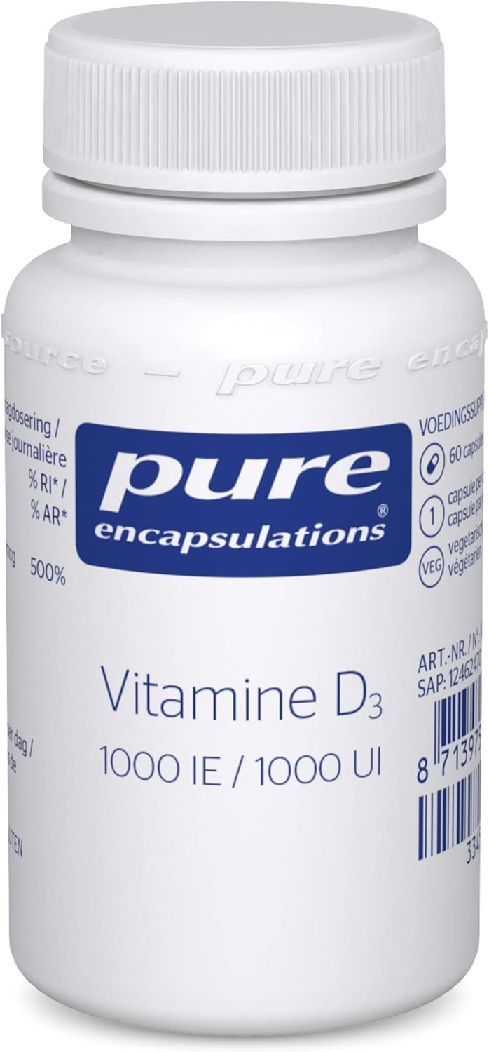 Free From: All Pure Encapsulations products are free from wheat, eggs, tree nuts, peanuts, gluten, artificial colors, flavors, sweeteners, coatings and shellac, GMOs, unnecessary binders, fillers and preservatives. Pure Quality: Our supplements are made with only premium ingredients from trusted suppliers and guided by our nutritionists. They are carefully produced and tested to verify their potency and purity. Dosage: Take 1 capsule per day with a meal. Provides 10 mcg of highly absorbable vitamin D3 for a healthy immune system. Active ingredients: Vitamin D3 contributes to the normal absorption of calcium and helps maintain healthy muscle function and the normal functioning of bones and teeth. Vitamin D3: Our body naturally produces vitamin D3 under the influence of direct sunlight on the skin. The rate of synthesis is limited by several factors, especially season.Pure Encapsulations - Vitamine D3 400 IU - Essentieel voor Botmetabolisme, het Immuunsysteem, Calciummetabolisme en Spierfunctie - 60 CapsulesVrij Van: Alle producten van Pure Encapsulations zijn vrij van tarwe, eieren, boomnoten, pinda's, gluten, kunstmatige kleurstoffen, smaken, zoetstoffen, coatings en schellak, GGO's, onnodige bindmiddelen, vulstoffen en conserveermiddelen. Pure Kwaliteit: Onze supplementen worden gemaakt met alleen premium ingrediënten van vertrouwde leveranciers en begeleid door onze voedingsdeskundigen. Ze worden zorgvuldig geproduceerd en getest om hun potentie en zuiverheid te verifiëren. Dosering: Neem 1 capsule per dag bij de maaltijd. Levert 10 mcg zeer goed opneembare vitamine D3 voor een gezond immuunsysteem. Actieve ingrediënten : Vitamine D3 draagt bij tot de normale opname van calcium en helpt bij het behoud van een gezonde spierfunctie en de normale werking van botten en tanden. Vitamine D3: Ons lichaam maakt van nature vitamine D3 aan onder invloed van direct zonlicht op de huid. De snelheid van de synthese wordt beperkt door verschillende factoren, met name het seizoen.