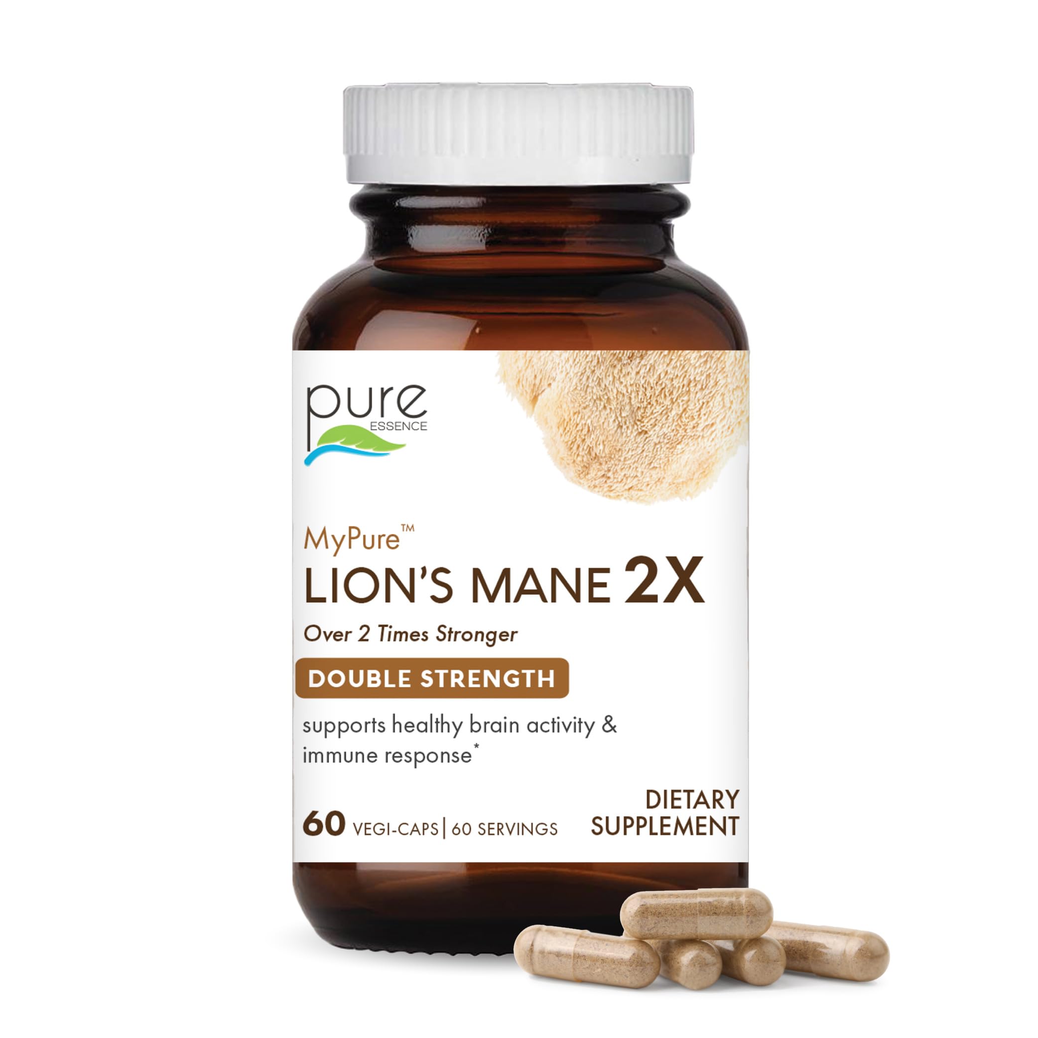 PURE ESSENCE LABS MyPure Lion's Mane 2X - Double Strength Brain Support Supplement with 100% Organic Fruiting Body Lion's Mane for Cognitive Health, Focus, Memory & Mental Clarity, 60 Capsules 60 Count (Pack of 1)