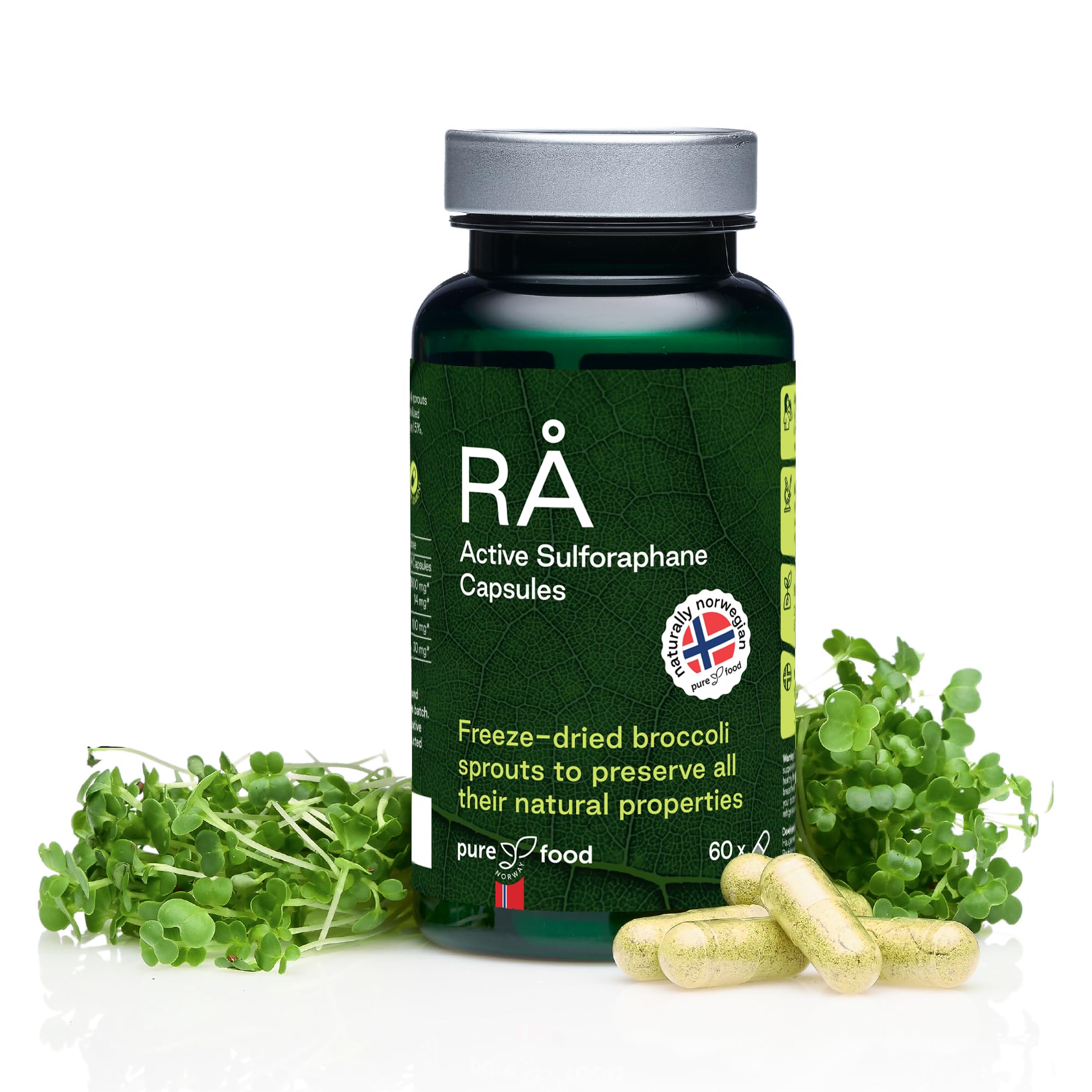 RÅ Capsules actives de sulforaphane de Norvège - 28500 mg de pousses de brocoli lyophilisées - Sans extrait - Capsules de brocoli à spectre complet actif - 60 gélules Pure Food Norway