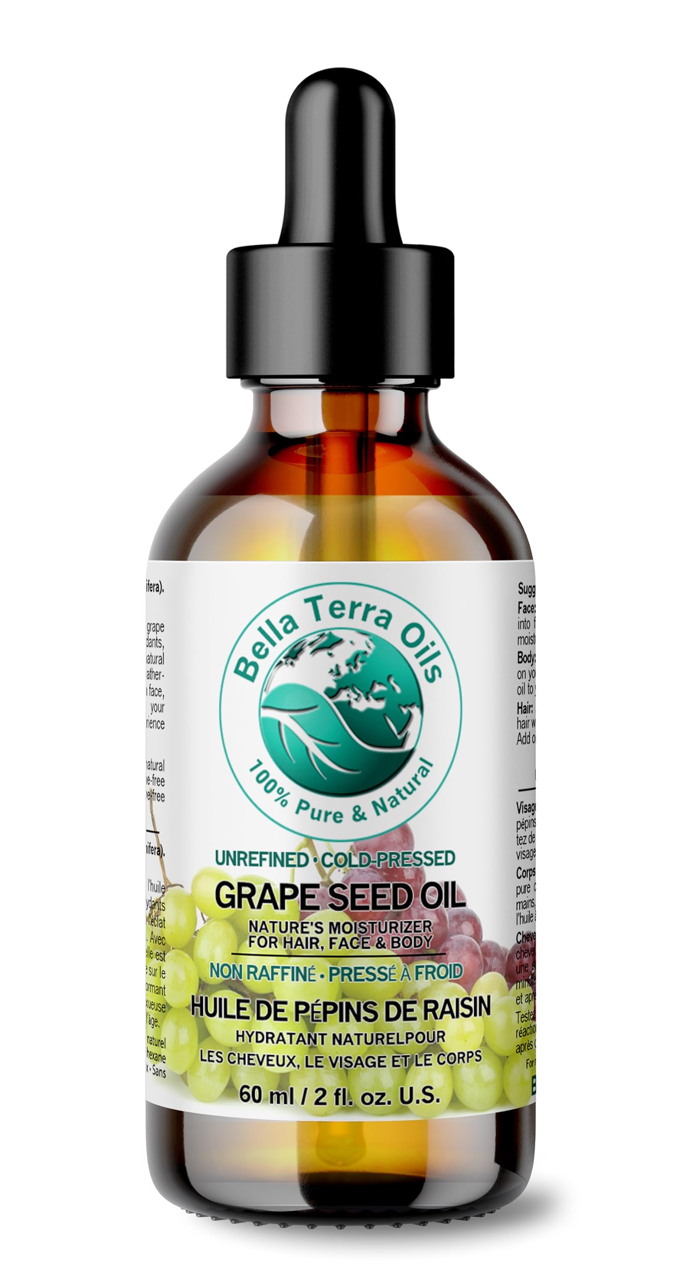 Pure Grape Seed Oil 60ml Antioxidant-Rich Lightweight Radiant Skin Frizz-Free Hair Silky Touch Bella Terra Oils 60 ml (Pack of 1)