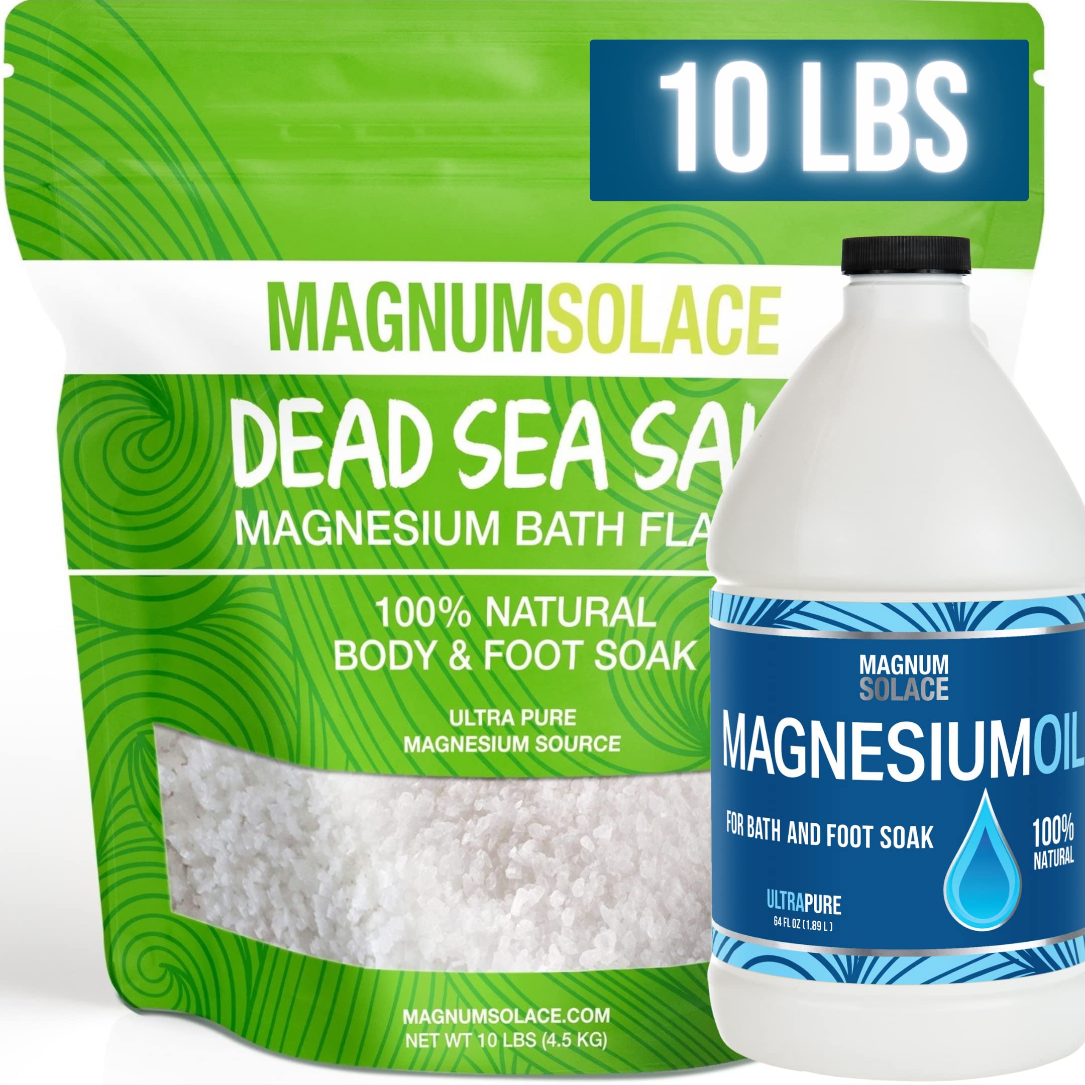 Magnesium chloride bath flakes offer a more effective topical magnesium solution for bath soaks and foot baths. ULTRA PURE, Odorless, Clear - Our Magnesium Oil is 100 PURE TESTED - Made using 6 stages of purification and reverse osmosis technology. HIGH QUALITY - our laboratory testing facility is government certified and staffed with professional technician experts in saline mixtures. MAGNESIUM OIL WORKS. Relax Soak with Magnesium Bath Flakes. BUNDLE CONTAINS 2 ITEMS: 1 x magnesium oil refill jub (64 oz), 1 x large bag magnesium bath flakes (10 lb).