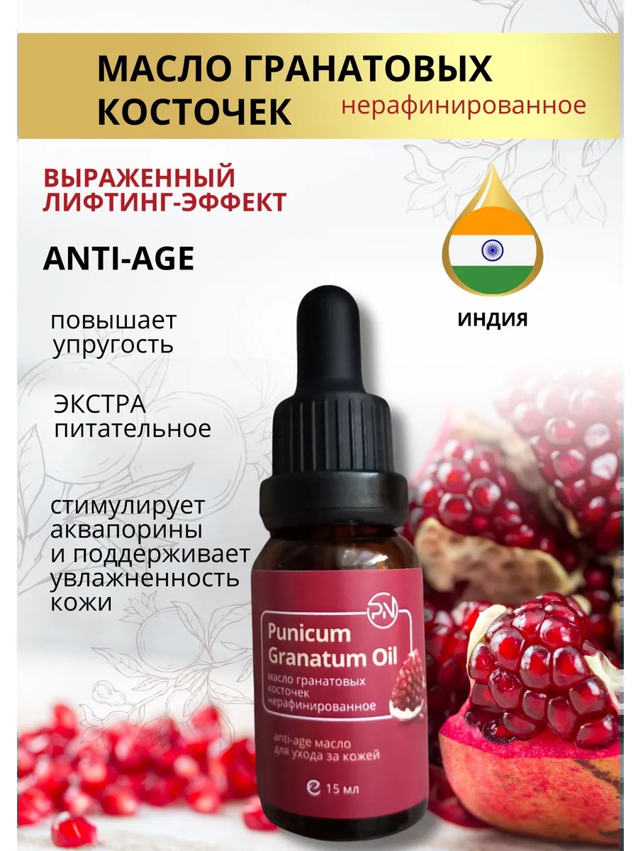 Антивозрастный уход для всех типов кожи. Способствует клеточному делению, устраняет морщины. Используется для предотвращения и устранения растяжек. Масло семян граната и его основной компонент, пуническая кислота (конъюгированная линоленовая кислота), обладают сильными противовоспалительными и антиоксидантными действием.