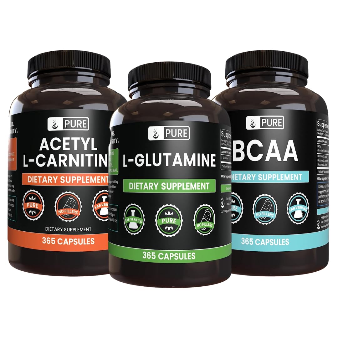 Always Pure: No additives, stearates, or rice fillers. Acetyl L-Carnitine is naturally found in meat dairy products. BCAA is an amino acid blend of micronized L-Leucine, L-Valine, and L-Isoleucine. L-Glutamine is an amino acid naturally found in protein-rich foods. PURE Acetyl L-Carnitine, L-Glutamine, and BCAA Capsule Bundle (365 Capsules Each).