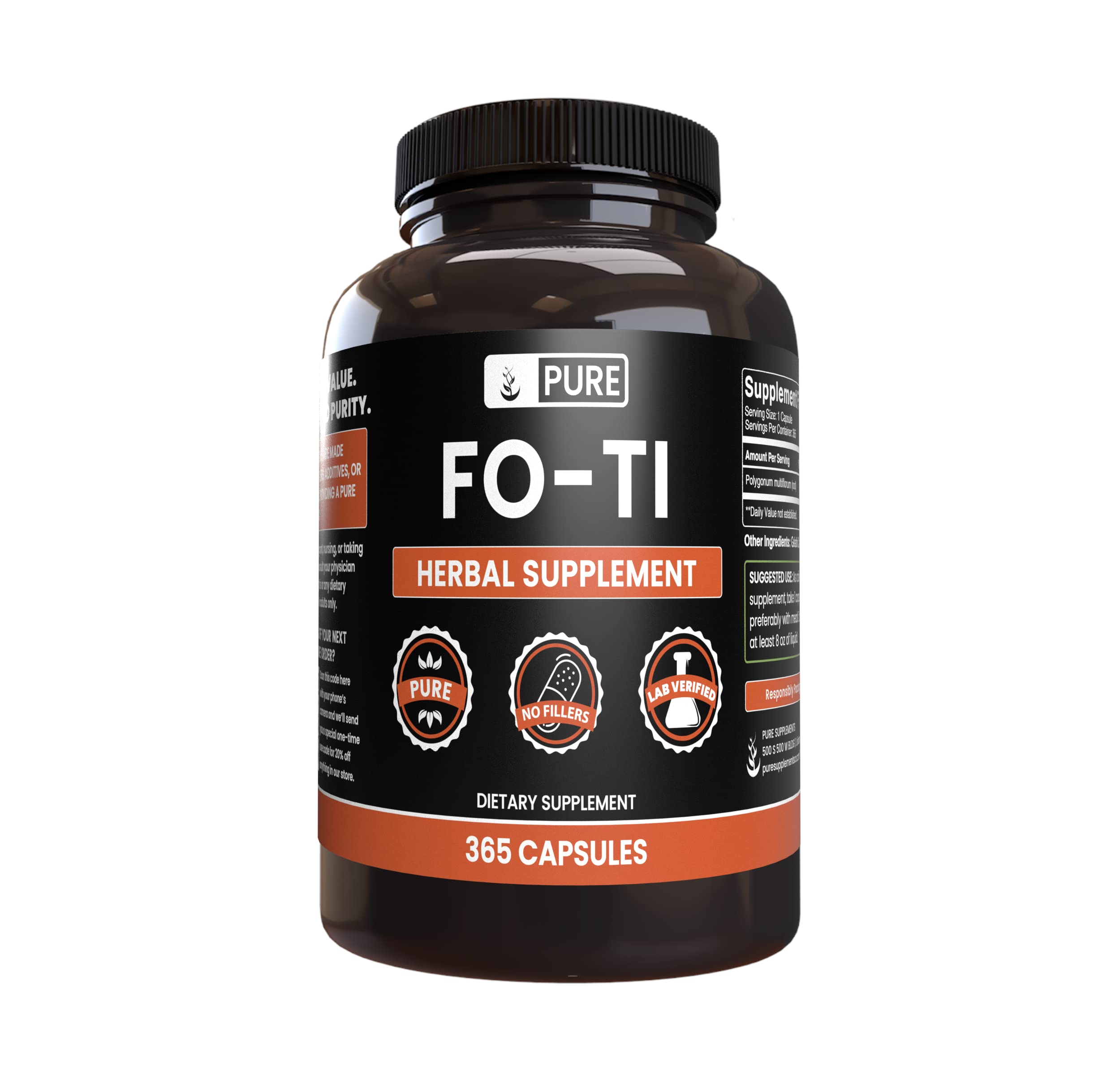 365 Day Supply: 1 year of peak support. Always Pure: No additives, stearates, or rice fillers. Fo-Ti is an herb native to China. Fo-Ti Capsules are filled with a single ingredient, providing a pure undiluted supplement.