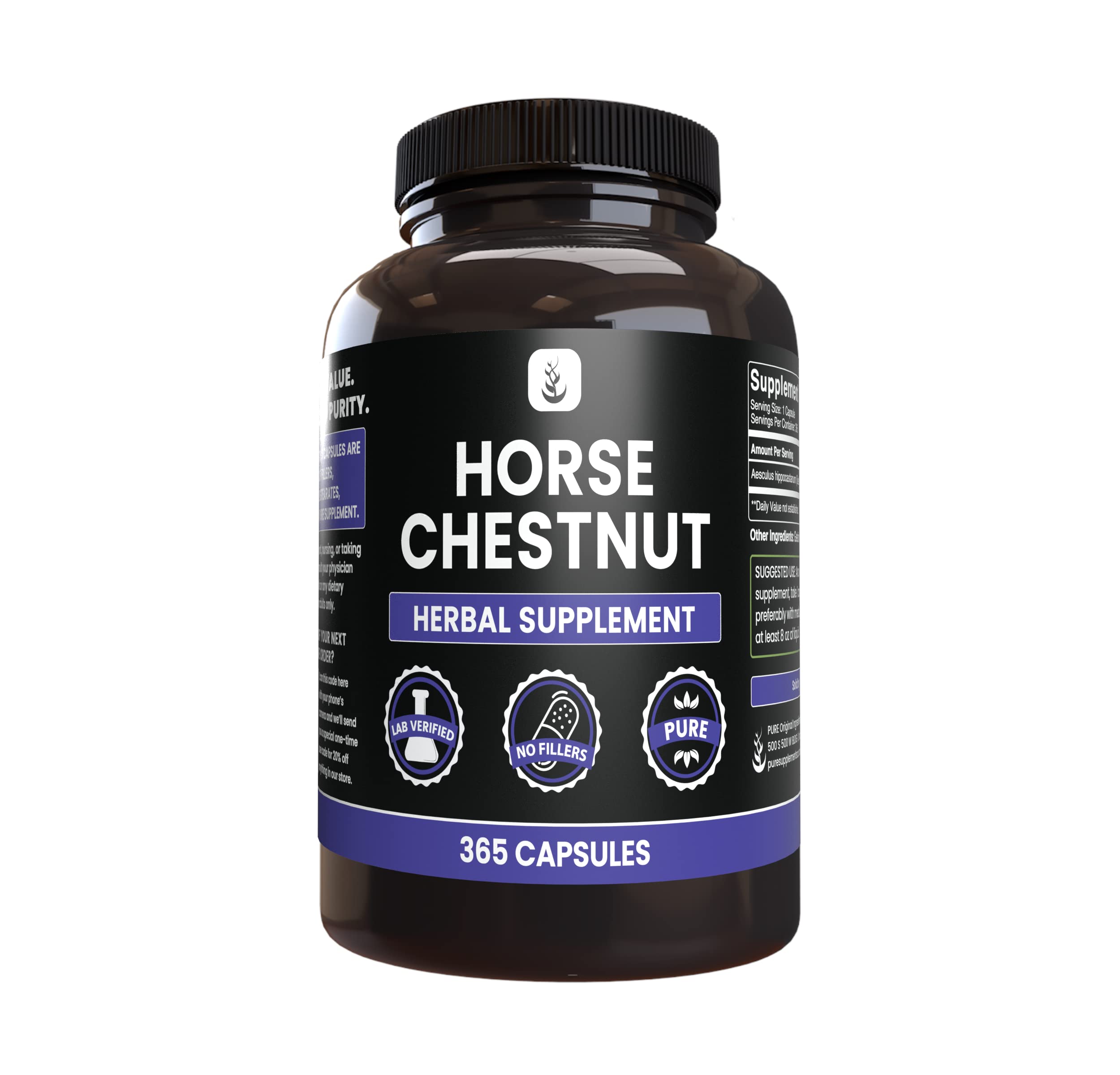 PURE ORIGINAL INGREDIENTS Horse Chestnut (365 Capsule) No Magnesium Or Rice Fillers Always Pure Lab Verified 365 Count (Pack of 1)