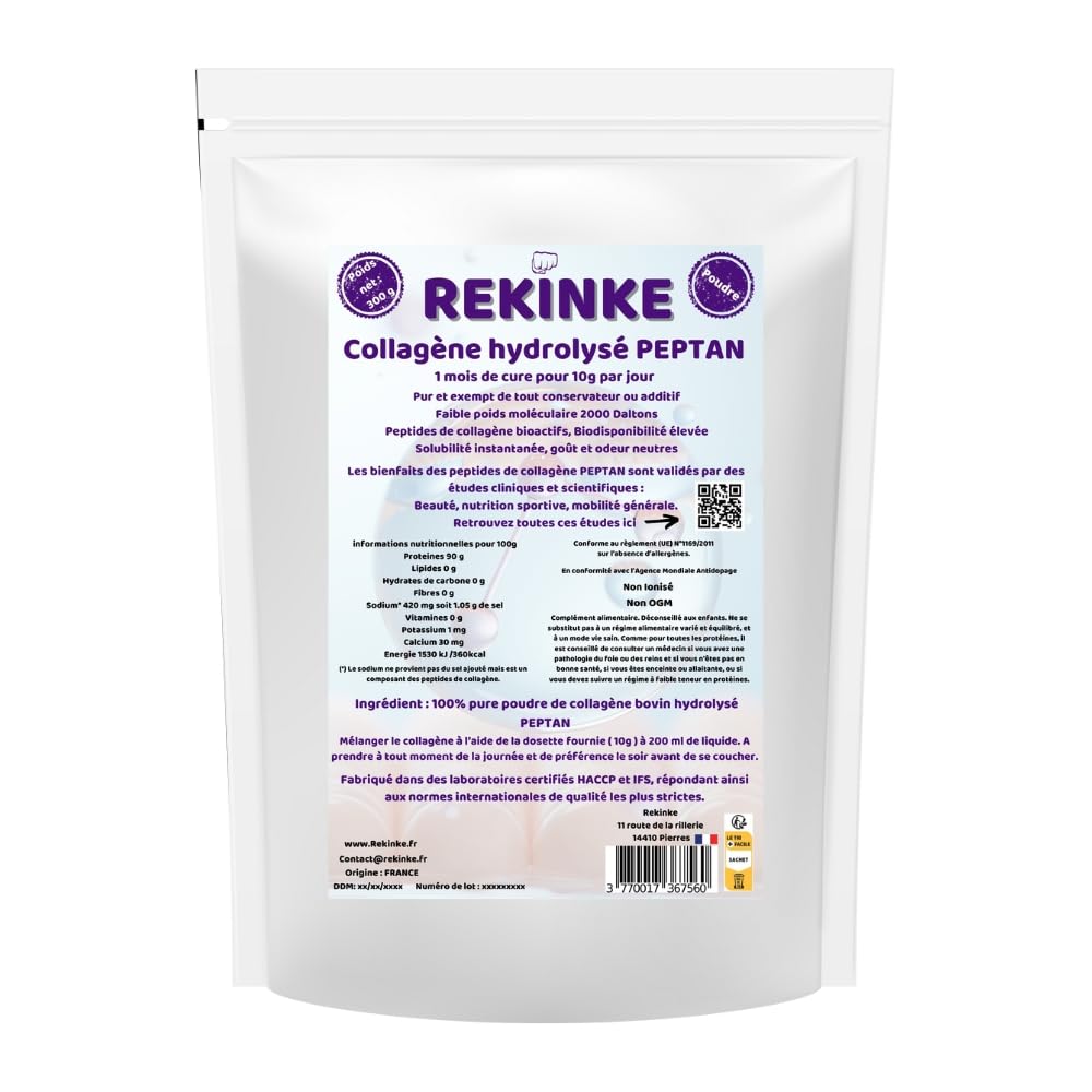: Treat your body to a premium supplement with Rekinke Peptan Type 1 Bovine Collagen. This pure, bioavailable, hydrolyzed collagen is a rich source of essential amino acids, with a particularly high concentration of glycine, a key amino acid for healthy skin, joints, and muscles. Packaged in a resealable 300g doypack of high-quality collagen for daily or extended use. A 10g measuring scoop is included. - Rich in Amino Acids: Peptan Collagen is a concentrated source of essential amino acids, including glycine, proline, and hydroxyproline. These amino acids play a crucial role in the synthesis of natural collagen, essential for the structure of skin, bones, and joints. - Glycine: An Essential Amino Acid: Peptan Bovine Collagen is particularly rich in glycine, an amino acid that makes up approximately one-third of its composition. Glycine is essential for collagen production in the body and actively participates in tissue repair and skin regeneration. It also helps maintain flexible joints and reduce joint pain. - Support for skin, joints, and muscles: Thanks to its high concentration of amino acids, this collagen supports skin firmness and elasticity, improves joint mobility, and contributes to muscle health by strengthening connective tissue. - Optimal bioavailability: Hydrolyzed collagen breaks down into small peptides, allowing for rapid absorption and maximum effectiveness. You quickly feel the benefits on your skin, joints, and muscles. Easy to consume: Rekinke Peptan Collagen dissolves easily in hot drinks, smoothies, or yogurt thanks to its fine texture and neutral taste. Why choose Rekinke Peptan Type 1 Collagen? Rekinke Peptan Type 1 bovine collagen is selected for its purity and quality. Each sachet contains carefully hydrolyzed collagen peptides, ensuring optimal bioavailability for visible results. This natural supplement, free of additives and preservatives, is the ideal choice to boost your skin health, support your joints, and improve your overall well-being. Directions: Mix 10g, or one tablespoon of collagen, into a hot beverage, smoothie, or any other food of your choice. For optimal results, consume 1 to 2 servings per day. Ingredients: 100 pure hydrolyzed bovine collagen powder. PEPTAN Instructions: Mix the collagen using the provided scoop (10g) with 200ml of liquid. Take at any time of day, preferably in the evening before bed. Safety Warning: Food supplement. Not recommended for children. This product is not a substitute for a varied and balanced diet and a healthy lifestyle. As with all proteins, it is advisable to consult a doctor if you have liver or kidney disease, are not in good health, are pregnant or breastfeeding, or need to follow a low-protein diet. See more