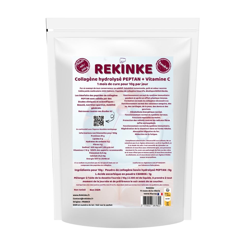 : Give your body a premium supplement with Rekinke Peptan Type 1 Bovine Collagen, fortified with vitamin C. L-ascorbic acid contributes, among other things, to normal collagen formation. Pure, bioavailable hydrolyzed collagen is a rich source of essential amino acids, with a particularly high concentration of glycine, a key amino acid for healthy skin, joints, and muscles. Vitamin C also contributes to: normal function of the immune system during and after strenuous physical activity normal energy-yielding metabolism normal function of the nervous system normal mental function protection of cells from free radicals (antioxidant effect) normal function of the immune system regeneration of vitamin E in its reduced form intestinal absorption of iron and reduction of tiredness and fatigue. Packaged in a resealable 300g doypack of high-quality collagen and pure vitamin C for daily or extended use. A 10g measuring spoon is included. -Rich in amino acids: Peptan collagen is a concentrated source of essential amino acids, including glycine, proline, and hydroxyproline. These amino acids play a crucial role in the synthesis of natural collagen, essential for the structure of skin, bones, and joints. -Glycine: An essential amino acid: Peptan bovine collagen is particularly rich in glycine, an amino acid that makes up about one-third of its composition. Glycine is essential for collagen production in the body and actively participates in tissue repair and skin regeneration. It also helps maintain flexible joints and reduce joint pain. -Supports skin, joints, and muscles: Thanks to its high concentration of amino acids and the presence of vitamin C, this collagen supports skin firmness and elasticity, improves joint mobility, and contributes to muscle health by strengthening connective tissues. - Optimal bioavailability: Hydrolyzed collagen breaks down into small peptides, allowing for rapid absorption and maximum effectiveness. You'll quickly feel the benefits on your skin, joints, and muscles. Easy to consume: Rekinke Peptan Collagen dissolves easily in hot drinks, smoothies, or yogurt thanks to its fine texture and neutral taste. Why choose Rekinke Peptan Type 1 Collagen fortified with vitamin C? Rekinke Peptan Type 1 bovine collagen is selected for its purity and quality. Each sachet contains carefully hydrolyzed collagen peptides and 100 pure, easily absorbed vitamin C, providing optimal bioavailability for visible results. This natural supplement, free of additives and preservatives, is the ideal choice to boost your skin health, support your joints, and improve your overall well-being. Directions: Dissolve 10g, or one tablespoon of collagen, in a hot drink, smoothie, or any other food of your choice. For optimal results, consume 1 to 2 servings per day. Ingredients: 100 pure hydrolyzed bovine collagen powder PEPTAN vitamin C. Instructions: Mix the collagen vitamin C using the provided scoop (10g) with 200ml of liquid. Take at any time of day, preferably in the evening before bed. Safety Warning: Food supplement. Not recommended for children. This product is not a substitute for a varied and balanced diet and a healthy lifestyle. As with all proteins, it is advisable to consult a doctor if you have liver or kidney disease, are not in good health, are pregnant or breastfeeding, or need to follow a low-protein diet. See moreReduces fatigue. Contributes, among other things, to normal collagen formation. Regenerates vitamin E in its reduced form. Supports normal energy metabolism. Supports normal immune system function during and after intense physical exertion. Supports normal nervous system function. Supports normal mental function. Protects cells against free radicals (antioxidant effect). Supports normal immune system function. One-month course of treatment with 10g per day. Measuring spoon included. Low molecular weight 2000 Daltons. Bioactive collagen peptides, high bioavailability. Pure and free from any preservatives or additives. Non-GMO. Non-ionized. Compliant with the World Anti-Doping Agency.Description du produit Offrez à votre corps un supplément de qualité supérieure avec le collagène bovin Peptan Type 1 de Rekinke renforcé en vitamine C L-Acide ascorbique contribue entre autre à la formation normale du collagène Le collagène hydrolysé, pur et biodisponible, est une source riche en acides aminés essentiels, avec une concentration particulièrement élevée en glycine, un acide aminé clé pour la santé de votre peau, de vos articulations et de vos muscles. La vitamine C contribue également au fonctionnement normal du système immunitaire pendant et après un effort physique intense. Métabolisme énergétique normal. Fonctionnement normal du système nerveux. Fonctions mentales normales. Protection des cellules contres les radicaux libres (effet antioxydant). Fonctionnement normal du système immunitaire. Régénération de la vitamine E dans sa forme réduite. Absorption digestive du fer. Réduction de la fatigue. Conditionné en doypack refermable de 300g de collagène de haute qualité et de pure vitamine C pour un usage quotidien ou prolongé. Cuillère doseuse de 10g fournie. -Riche en acides aminés : Le collagène Peptan est une source concentrée en acides aminés essentiels, notamment la glycine, la proline et l'hydroxyproline. Ces acides aminés jouent un rôle crucial dans la synthèse du collagène naturel, essentiel pour la structure de la peau, des os et des articulations. - Glycine : Un acide aminé essentiel: Le collagène bovin Peptan est particulièrement riche en glycine, un acide aminé qui représente environ un tiers de sa composition. La glycine est indispensable pour la production de collagène dans l'organisme et participe activement à la réparation des tissus et à la régénération de la peau. Elle aide également à maintenir des articulations souples et à réduire les douleurs articulaires. - Soutien à la peau, aux articulations et aux 