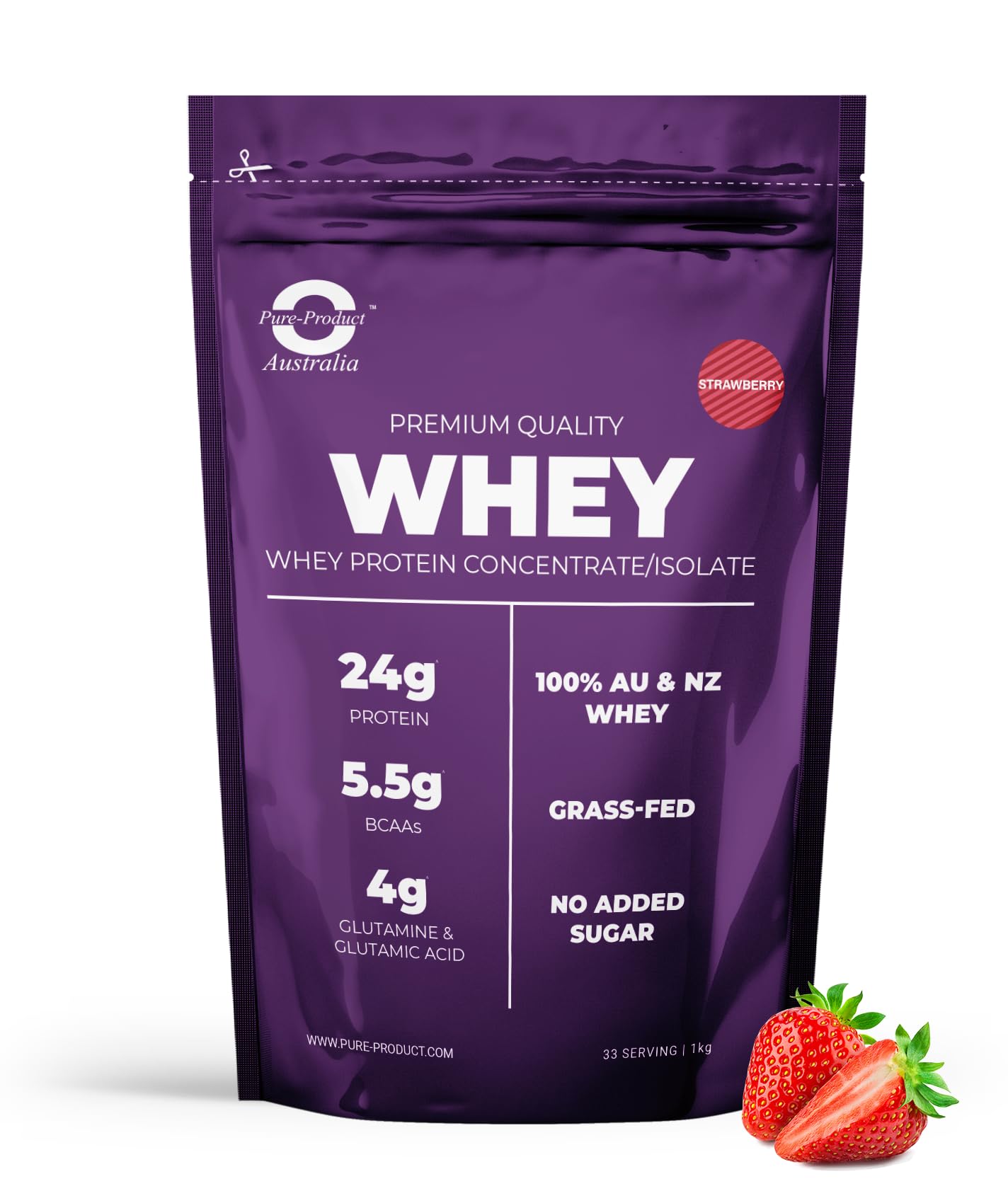 Pure Product Australia - Whey Protein Concentrate & Isolate - Premium Grass Fed AU & NZ Whey - 24g Protein per Serve - Non GMO - 2kg (4.4 lbs) - Strawberry