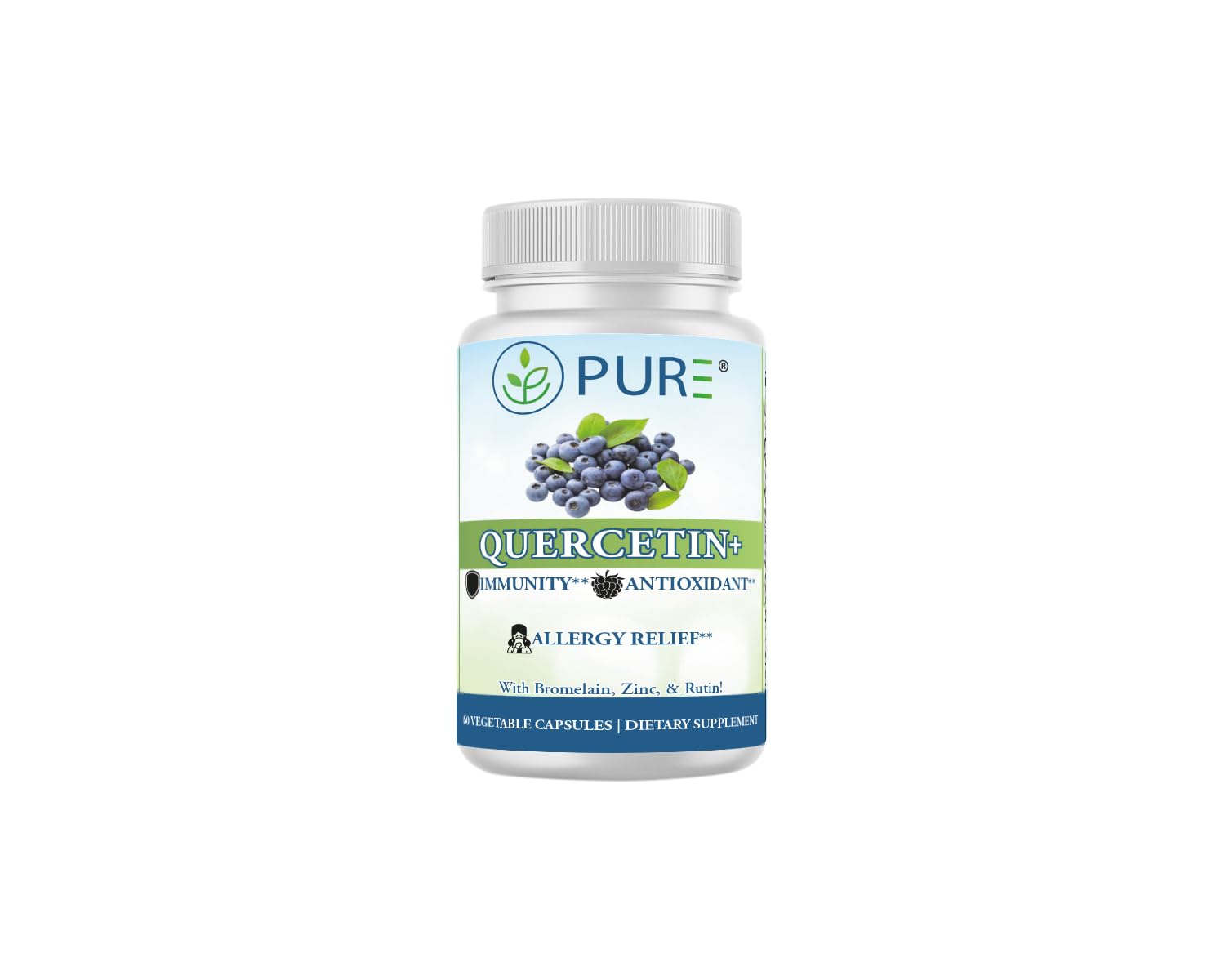 PURE Quercetin is a premium supplement featuring a blend of Quercetin, Bromelain, Rutin, and Zinc to complement a healthy lifestyle. This high-quality non-GMO, gluten-free formula delivers 60 easy-to-swallow capsules for a 30-day supply, with 2 capsules per serving. Crafted in the USA at an FDA-registered, GMP-certified facility. PURE: Pure Body, Pure Living!