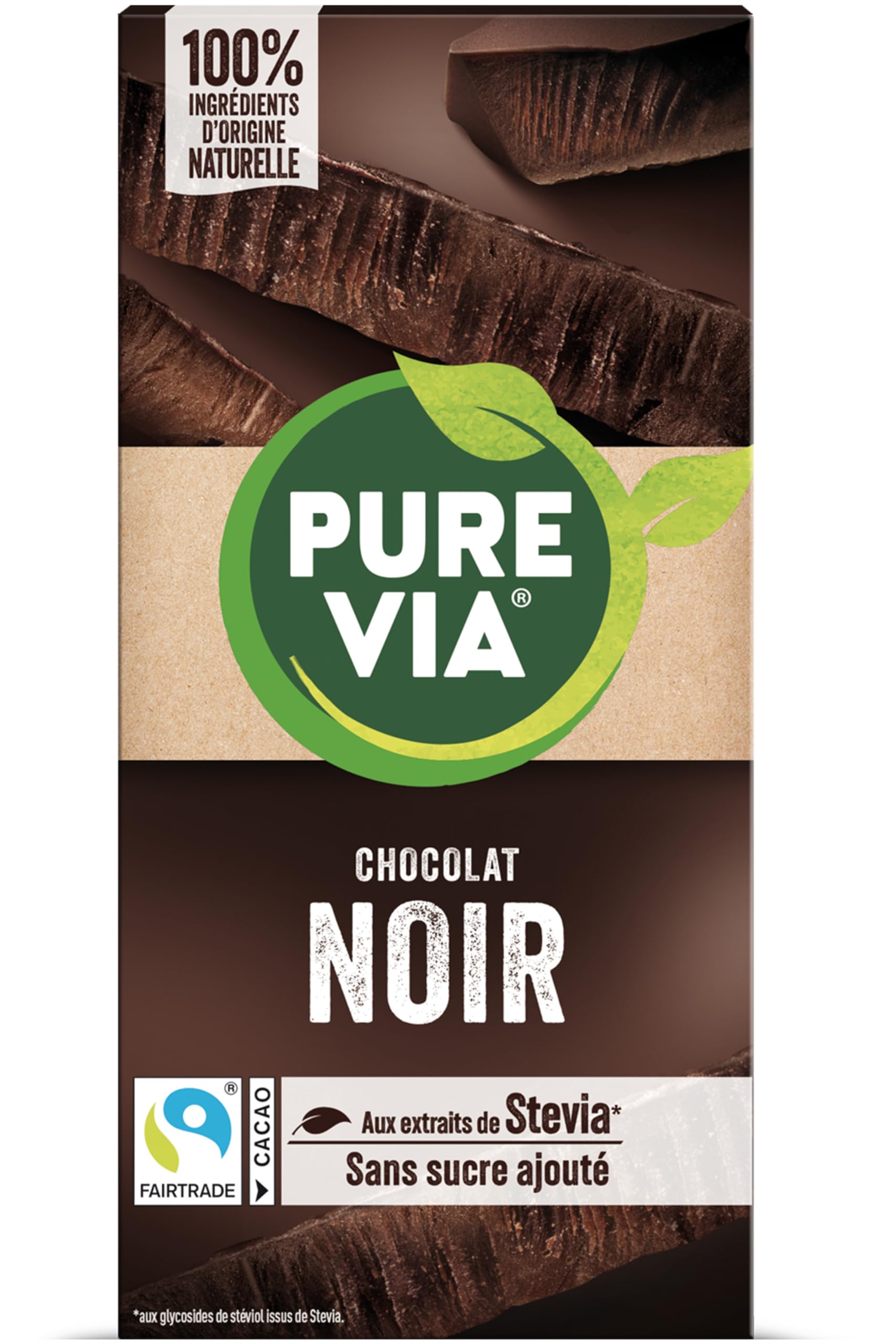 100 Naturally sourced ingredients With Stevia extracts ( with steviol glycosides from Stevia) no added sugar FAIRTRADE INGREDIENTS Dark chocolate with no added sugar and sweeteners. Ingredients: cocoa mass, sweetener: erythritol, cocoa butter, inulin, fat-reduced cocoa powder, emulsifier: lecithins, sweetener: steviol glycosides from Stevia, natural vanilla flavoring. Cocoa: 60 minimum in dark chocolate. May contain traces of milk, soy, nuts, sesame. SAFETY WARNING Contains sweeteners. May contain traces of milk, soy, nuts, sesame. Do not consume in large quantities. Keep out of reach of children. Fairtrade Cocoa: Guarantees fair pay and better working conditions for cocoa farmers. Stevia: A natural sweetener long appreciated for its sweetening properties without any calories. 100 Natural Ingredients: Made from carefully selected ingredients, including Fairtrade certified cocoa, with no artificial colors and no palm oil. Savor the finesse of our 60 cocoa dark chocolate: an ideal taste experience for true dark chocolate lovers. Pure Via Dark Chocolate: A dark chocolate bar, with no added sugar and stevia extracts. 100 Ingrédients d'origine naturelle Aux extraits de Stevia ( aux glycosides de stéviol issu de Stevia) sans sucre ajouté FAIRTRADE INGRÉDIENTS Chocolat noir sans sucre ajouté avec édulcorants. Ingrédients : pâte de cacao, édulcorant : érythritol, beurre de cacao,inuline, cacao maigre en poudre, émulsifiant : lécithines, édulcorant :glycosides de stéviol issus de Stevia, arôme naturel de vanille. Cacao : 60 minimum dans le chocolat noir. Peut contenir des traces de lait, soja, fruits à coques, sésame. AVERTISSEMENT DE SÛRETÉ Contient des édulcorants. Peut contenir des traces de lait, soja, fruits à coques, sésame. Ne pas consommer en grande quantité. Conserver hors de portée des enfants. Cacao Fairtrade : Garantit une juste rémunération et des meilleures conditionsde travail pour les producteurs de cacao. La stévia: un édulcorant naturel apprécié depuis longtemps pour ses vertus sucrantes sans aucune calorie. 100 ingrédients d'origine naturelle : Élaboré à partir d'ingrédients soigneusement sélectionnés, incluant du cacao certifié Fairtrade, sans colorant et sans huile de palme. Savourez toute la finesse de notre chocolat noir 60 de cacao: une expérience gustative idéale pour les véritables amateurs de chocolat noir. Pure Via Chocolat Noir : Une tablette de chocolat noir, sans sucre ajouté aux extraits de stevia.