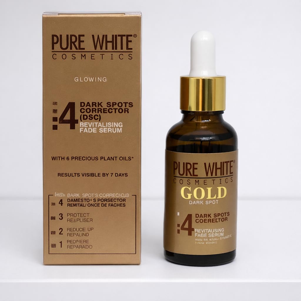 SIZE AND PACKAGING: Comes in a 30ml (1 fl.oz.) amber glass bottle with dropper applicator for controlled dispensing and protection of the serum formula. EASY APPLICATION: Convenient dropper bottle design allows for precise application on clean skin at night, making it simple to incorporate into your skincare routine. FAST-ACTING FORMULA: Designed to deliver visible results in as little as 7 days with consistent use, helping to fade dark spots and promote a more even-toned, glowing appearance. ENRICHED WITH PLANT OILS: Infused with 6 precious plant oils that work together to nourish and revitalize the skin while addressing hyperpigmentation and discoloration. DARK SPOT CORRECTOR: Pure White Cosmetics Gold Dark Spots Corrector is a revitalizing fade serum specifically formulated to target and reduce the appearance of dark spots, blemishes, and uneven skin tone for a brighter complexion.