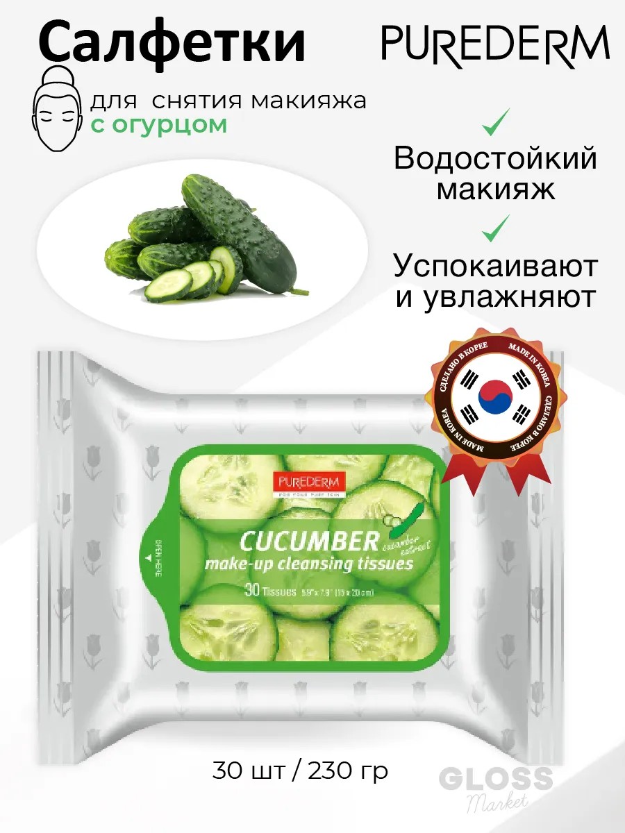 Purederm Make-Up Cleansing Tissues Cucumber - это мягкие и эффективные очищающие салфетки, специально разработанные для быстрого и бережного снятия макияжа с лица, глаз и губ. Благодаря содержанию экстракта огурца они не только удаляют даже водостойкий макияж, но и успокаивают, тонизируют и увлажняют кожу, предотвращая раздражения и сухость. Салфетки для снятия макияжа очищающие с экстрактом огурца содержат натуральные растительные экстракты и витамин Е, мягко удаляют макияж, придавая коже свежий вид. Тщательно удаляют подводку для глаз, тени, помаду и даже водостойкую тушь, не раздражая кожу. Благодаря удобству предварительно смоченных салфеток они действуют за считанные секунды, оставляя вашу кожу гладкой, свежей, увлажненной и совершенно чистой.