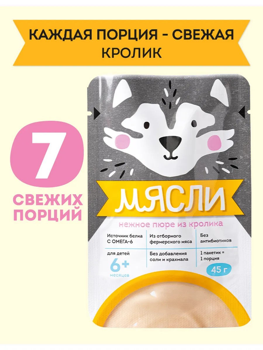 Пюре мясное детское МЯСЛИ кролик – это отличный выбор для вашего маленького гурмана. В упаковке вы найдете 14 порций по 45 г, каждая из которых содержит нежное и натуральное пюре из кролика, специально разработанное для детей с 6 месяцев. Это идеальный вариант для первого прикорма, который сочетает в себе вкус и высокое качество.
