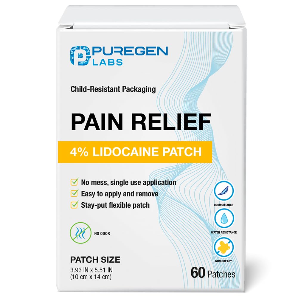 QUALITY YOU CAN TRUST: Our Fast-Acting Product is Non-Greasy, Odor-free and is for all Skin Types. SAFETY WARNING: Do not use it on large areas of the body, do not cover the area with waterproof bandages or plastic, these may increase the risk of side effects. INSTRUCTIONS: Before use on the skin, clean and dry the affected area as directed on the package. Please refer to the images on how to open and apply our patches. FAST ACTING LONG LASTING: Our Lidocaine 4 transdermal patch will start numbing in few minutes and last for up to 8 hours. MAXIMUN STREHGTH: Puregen Labs Lidocaine 4 transdermal patch is a local anesthetic . It prevents and treats pain caused by topical pain by blocking nerve endings in the skin. These patches can be used to temporary relief pain associated with sore back, neck, wrist, ankle, hip, shoulder, knee, elbow, and minor skin irritations.
