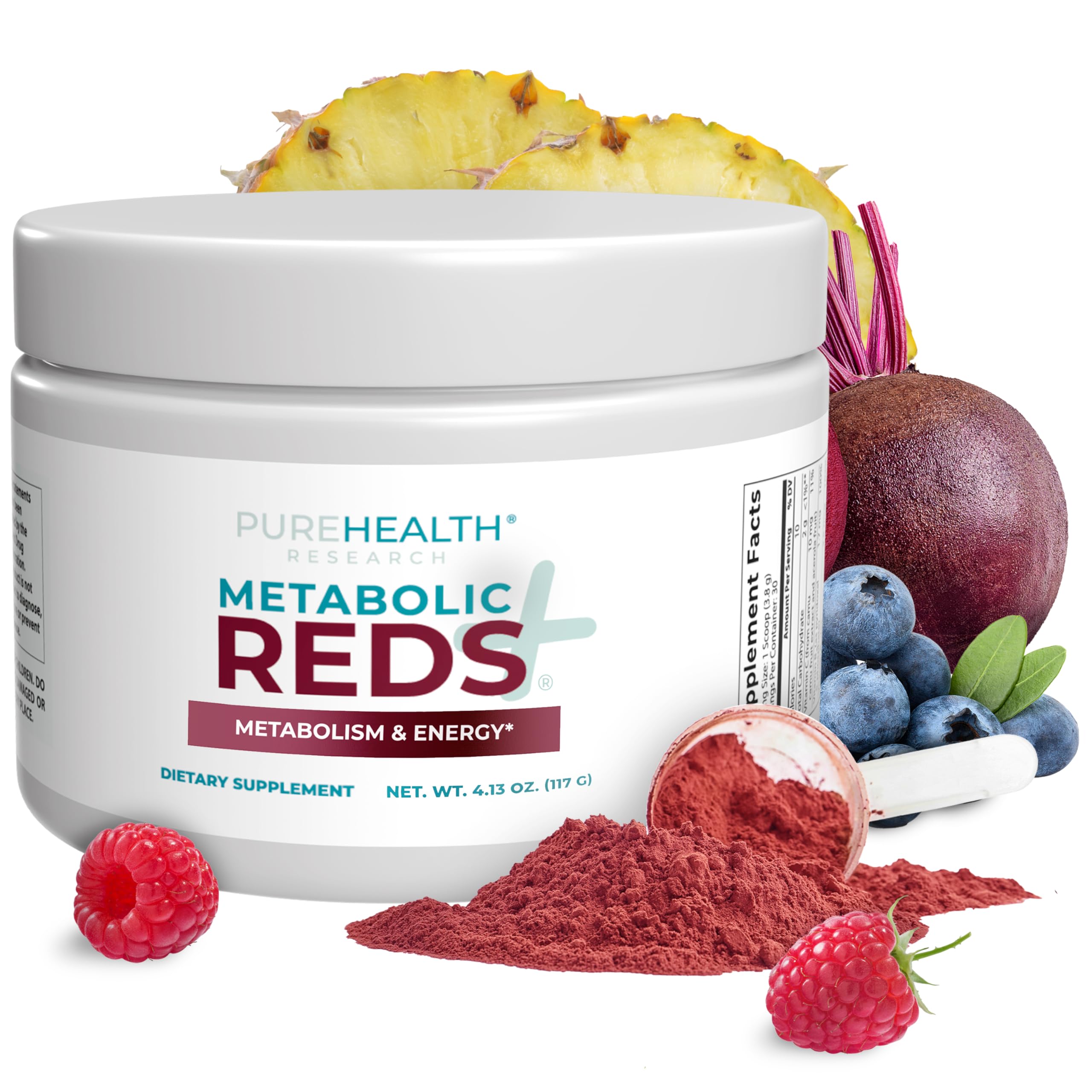 ONLY 10 CALORIES - Our metabolic reds powder is just 10 calories per serving. (Equal to 1 baby carrot!) No other brand gives you so many superfoods, in so few calories. Plus, it's made in the USA, Vegan, and free from gluten, dairy, GMOs, and soy. 4 EXQUISITE BLENDS IN ONE - This fruit and vegetable powder contains a Red Fruits Blend, an Adaptogenic Blend, a Probiotic Blend, and a Digestive Enzyme Blend. Together, that's 42 potent superfoods to support your vitality and whole-body health. HEALTH CAN BE TASTY - PureHealth Research Metabolic Reds isn't just good for your brain, immune system, and gut… it tastes amazing, too! Our berry powder is made from delicious, ripe fruits like blueberries, strawberries, raspberries, and pomegranates. BEETROOT POWER - Whether you're an athlete, or you're dealing with excess stress or immune issues, Metabolic Reds can help you achieve balanced, whole-body wellness. This is our premier metabolic renewal superfood powder. FIRST-CLASS SUPERFOOD POWDER - Fill in your nutritional gaps with this superb superfood powder with fruits, red beets, and potent antioxidants - the ultimate super foods for whole-body health.