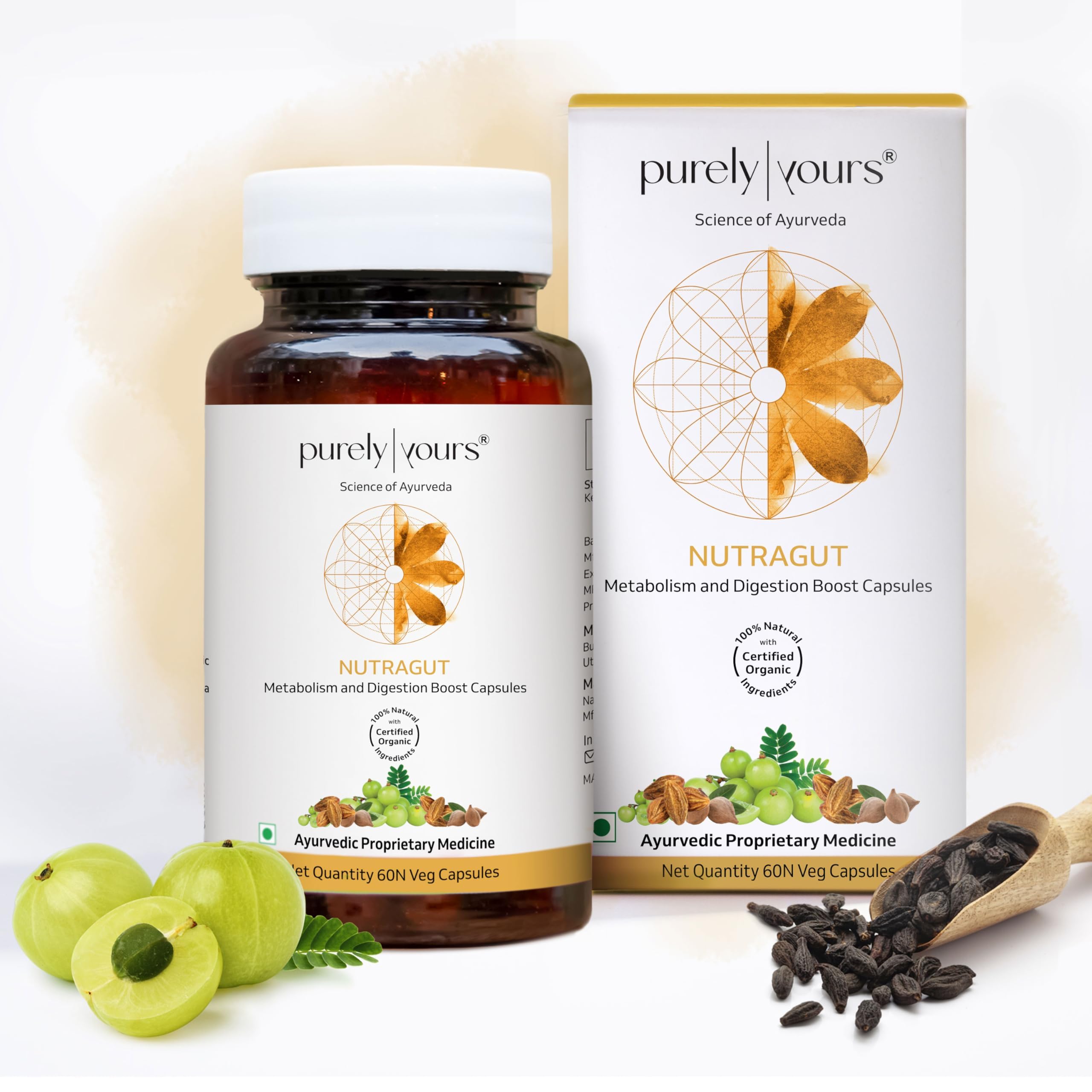 Purely Yours Nutra Gut is a powerful Ayurvedic supplement made with the traditional Triphala blend of Amalaki (Amla), Vibhitaki (Baheda), and Haritaki (Harad) to naturally support your digestive system. Each capsule is designed to promote smooth bowel movements, relieve constipation, and regulate metabolism, making daily digestion more comfortable and efficient. Nutra Gut provides a cooling and soothing effect to help manage acidity, reduce gas and bloating, and support natural detoxification. Its gentle formula also helps alleviate symptoms of Irritable Bowel Syndrome (IBS) while maintaining a healthy gut microbial balance essential for long-term wellness. Made with 100 natural ingredients, Nutra Gut is your daily dose of digestive care – chemical-free, safe, and rooted in Ayurveda.