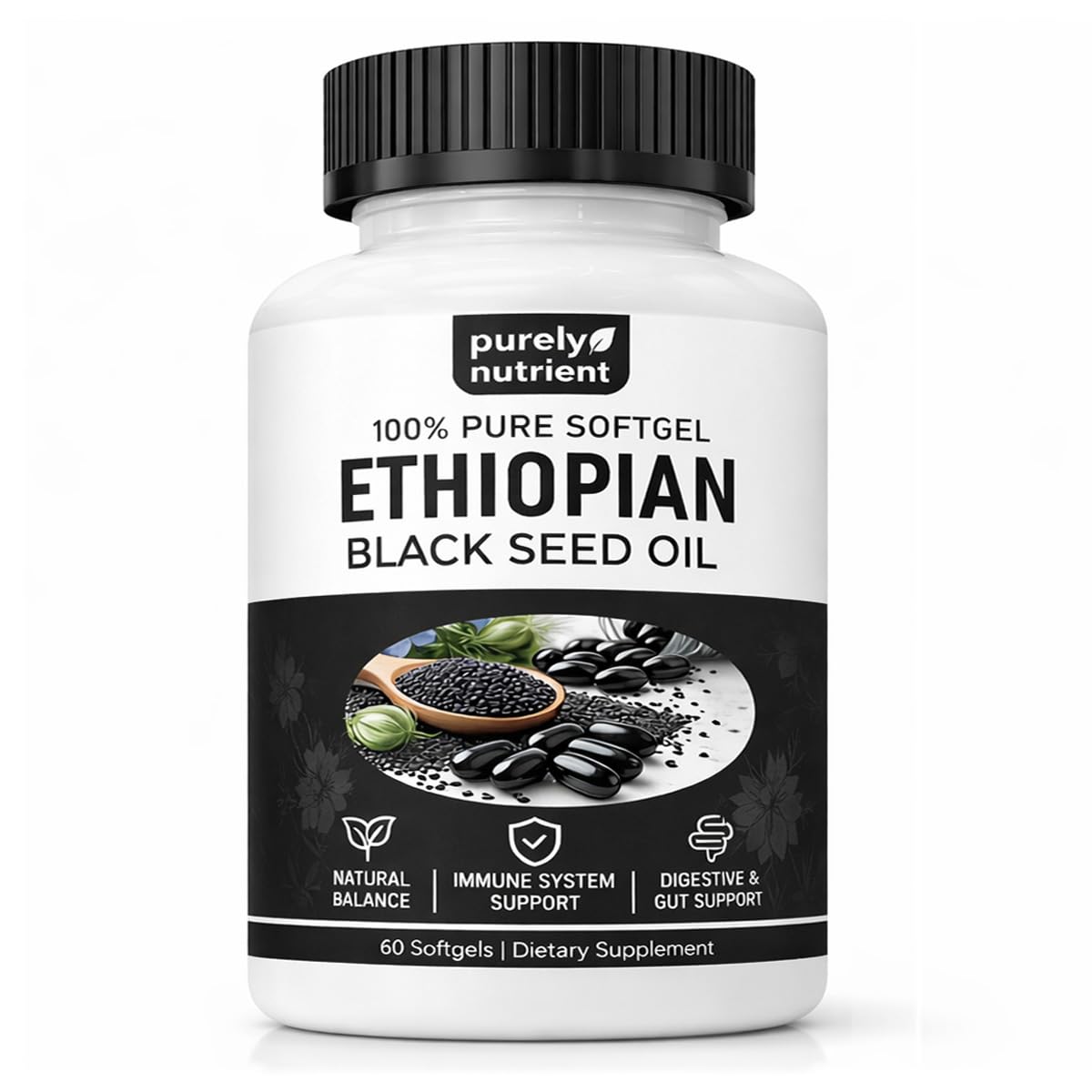 Easy Daily Use Take 2 softgels daily with water (preferably with a meal). Simple dosing that's easy to stick with. A convenient way to take purely ethiopian black seed oil every day, especially if you've been searching for pure ethiopian black seed oil in softgel form. Cold-Pressed Quality You Can Trust Crafted from organic, cold-pressed black seed oil to help preserve its natural character. Gentle processing avoids high heat and unnecessary steps for a clean, high-quality softgel—ideal for those who prefer purely ethiopian blackseed oil. For Everyday Vitality A plant-based daily option for maintaining a refreshed, ready-to-go feeling—especially on busy days. Add purely Ethiopian black seed oil to your routine for an easy daily addition that fits right in. Thymoquinone 4.64 Made with ethiopia highlands–sourced black seed oil featuring 4.64 thymoquinone—a clean, straightforward formula with no unnecessary extras. This purely ethiopian blackseed oil formula keeps it simple and focused. Organic Non-GMO Gluten-Free Purely nutrient ethiopian blackseed oil Softgels fit easily into everyday routines—simple ingredients and a clean formula you can stick with. If you're looking for purely ethiopian black seed oil, this daily format is an easy fit.