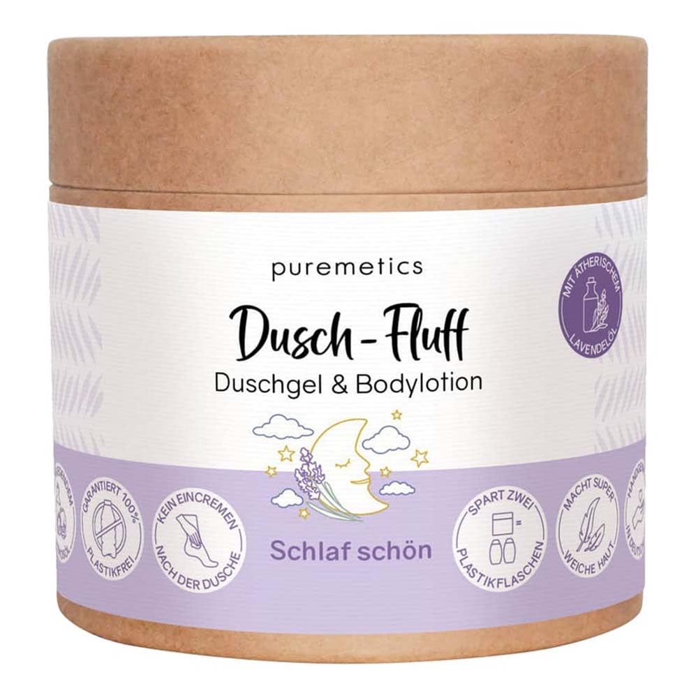 : puremetics "Beautiful Sleep" Shower Gel and Body Lotion in one. With lavender essential oil. Lavender essential oil works its magic in combination with the warm steam of the shower. It creates a gentle, fragrant symbiosis that acts like a soothing inhalation, allowing your mind to drift into a sea of calm and serenity. Shower gel and body lotion in one. With moisturizing coconut oil. Cleanses, cares for, and protects. With lavender essential oil. Super soft and long-lasting. To use: Wet skin thoroughly in the shower and gently massage in the shower liquid. Adding water creates a nourishing lather. While the formula cleanses the skin, the care phase melts with precious coconut oil to nourish the skin and protect it from external aggressors. Then rinse thoroughly and gently pat skin dry with a towel. Suitable for daily use. Note: The product packaging should not come into contact with water, as this may cause it to soften. We recommend transferring the shower stream into a sealed container or using a spoon to scoop out a small amount for showering. Storage: The cup is made of grease-resistant laminated kraft cardboard and paper. Please keep it dry. Disposal: Dispose of in the wastepaper basket. Ensure the inside of the cup is clean and free of product residue. Ingredients: GLYCERIN, AQUA, SODIUM LAUROYL ISETHIONATE, SORBITOL, COCOS NUCIFERA OIL, DISODIUM LAURYL SULFOSUCCINATE, SODIUM CHLORIDE, LAVANDULA ANGUSTIFOLIA OIL, LINALOOL, LIMONENE, LEVULINIC ACID, POTASSIUM SOLUM. Orbate. P.when('A').execute(function(A) { A.on('a:expander:toggle_description:toggle:collapse', function(data) { window.scroll(0, data.expander. expander[0].offsetTop-100) }) }) Safety Warning: The product packaging must not come into contact with water, otherwise it may soften. See more200g. Cleanses, cares for, and protects the skin. With lavender essential oil and moisturizing coconut oil. Shower gel and body lotion in one. 2-in-1 shower aerator – for a restful sleep.Description du produit puremetics Gel douche et lotion pour le corps « Sommeil beau » en un. À l'huile essentielle de lavande. L'huile essentielle de lavande déploie toute sa magie en combinaison avec la vapeur d'eau chaude de la douche. Il crée une symbiose douce et parfumée qui agit comme une inhalation apaisante et permet à votre esprit de plonger dans une mer de calme et de sérénité. Gel douche et lotion pour le corps en un. À l'huile de coco hydratante. Nettoyage, soin et protection. À l'huile essentielle de lavande. Super moelleux et durable. Utilisation : humidifiez bien la peau sous la douche et massez doucement le liquide de douche. L'ajout d'eau crée un plaisir moussant nourrissant. Pendant que la formule nettoie la peau, la phase de soin fond avec de l'huile de coco précieuse pour nourrir la peau et la protéger des agressions extérieures. Rincez ensuite abondamment et tamponnez doucement la peau avec une serviette. Convient pour un usage quotidien. Remarque : l'emballage du produit ne doit pas entrer en contact avec l'eau, sinon il peut se ramollir. Nous vous recommandons de transférer le flux de douche dans un récipient étanche ou d'en prendre une petite quantité pour la douche avec une cuillère. Rangement : le gobelet est fabriqué en carton kraft laminé résistant à la graisse et en papier. Veuillez le garder au sec. Élimination : jeter dans le vieux papier. Assurez-vous que l'intérieur du gobelet est propre et qu'il n'y a plus de résidus de produit. Ingrédients GLYCERINE, AQUA, SODIUM LAUROYL ISETHIONATE, SORBITOL, COCOS NUCIFERA OIL, DISODIUM LAURYL SULFOSUCCINATE, SODIUM CHLORIDE, LAVANDULA ANGUSTIFOLIA OIL, LINALOOL, LIMONENE, LEVULINIC ACID, POTASSIUM SOLUM. Orbate. P.when('A').execute(function(A) { A.on('a:expander:toggle_description:toggle:collapse', function(data) { window.scroll(0, data.expander. expander[0].offsetTop-100) }) }) Avertissement De Sûreté L'emballage du produit ne doit pas entrer en contact avec l'eau, sinon il peut se ramollir. Voir plus200 g. Nettoyage, soin et protection de la peau. Avec huile essentielle de lavande et huile de coco hydratante. Gel douche et lotion pour le corps en un. Aérateur de douche 2 en 1 - Pour un sommeil agréable.puremetics Bain de douche 2 en 1 pour un sommeil agréable - 200 g