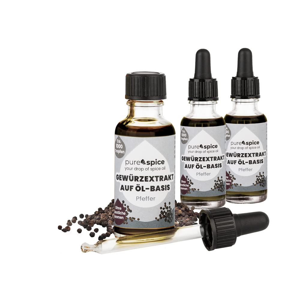Just a few drops of pure spice lead to a perfect taste. For example, you get the taste of Oriental, Italy, Mexico or Asia in your home. However, we not only have oil-based herbal extracts in our range, but also individual herbal extracts such as cinnamon, garlic and pepper – each with a high flavor intensity. Because the pure spice herbal extracts consist of 100 pure taste - completely without flavor enhancer and without artificial flavors. This way you can not only enjoy the fantastic variety of herbs, but also taste the natural and soft finish with every bite. Finally, we pay attention to selected, high-quality raw materials in both development and production – for a completely unadulterated pleasure full of tempting herbs.Purespice Veganistische kruidenextracten op oliebasis, peper, zonder kunstmatige aroma's of smaakversterkers, kruiden in enkele seconden [kruidenolie, set van 3] Al enkele druppels pure spice leiden tot een perfecte smaak. Zo krijg je bijvoorbeeld de smaak van het Oosters, Italië, Mexico of Azië in huis. Wij hebben echter niet alleen kruidenextracten op oliebasis in het assortiment, maar ook individuele kruidenextracten zoals kaneel, knoflook en peper – elk met een hoge smaakintensiteit. Want de pure spice kruidenextracten bestaan uit 100 pure smaak – geheel zonder smaakversterker en zonder kunstmatige aroma's. Zo kun je niet alleen genieten van de fantastische verscheidenheid aan kruiden, maar smaakt met elke beet ook de natuurlijke en zachte afwerking. Ten slotte letten wij zowel bij de ontwikkeling als bij de productie op geselecteerde, hoogwaardige grondstoffen – voor een volledig onvervalst genot vol verleidelijke kruiden.