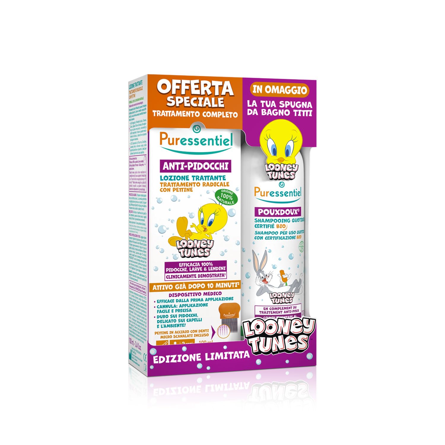 Limited edition head lice treatment kit with lotion and gentle shampoo. Natural formulas to eliminate, soothe, and protect children's hair. INGREDIENTS Lotion: • 6 plant oils: sweet almond, tamanu, coconut, jojoba, castor, and sunflower, which work mechanically by blocking the respiratory openings. Thanks to this asphyxiation mechanism, lice cannot develop resistance. • 4 essential oils: tea tree, carnation, true lavender, and rose geranium, with soothing and restorative properties, ideal for calming an itchy scalp. Shampoo: Ingredients: Aqua, Sodium LAURYL SULFATE, Lavender ANGELTIFOLIA FLOWER WATER , INULIN, SODIUM COCOAMPHOACETATE, SODIUM PCA, GLYCERIN, CAPRYLYL CAPRYL GLUCOSIDE, CITRIC ACID, SODIUM CHLORIDE, SODIUM benzoate, ACETUM , COCOGLUCO. Side, Glyceryl Oleate, Lavandula Angustifolia Oil , Cananga Odorée Flower Oil , Lavande Hybride Grosse Herb Oil , Aloe Barbadensis Leaf Juice Powder , Pelargonium Graveolens Oil , Potassium Sorbate, Hydrogenated Palm Glycerides, Tocopherol, Sodium Hydroxide, Linalool , Benzyl Benzoate , Geraniol , Citronellol . Ingredients from organic farming. Processed from organic ingredients. Naturally occurring in essential oils. 1Usage test on 22 people for 28 days. INSTRUCTIONS FOR USE Apply the 100ml Anti-Lice Lotion to wet hair with a comb, leave on, then rinse thoroughly. Use the 200ml Pouxdoux BIO Shampoo to wash the hair of the whole family. See moreSuitable for children aged 3 and up: Our products are made with natural active ingredients extracted from organic essential oils (true lavender), contain no neurotoxic chemical insecticides, and are free of silicone, parabens, preservatives, and fragrances. The lotion has a 100 natural formula for safe head lice treatment. Limited Looney Tunes Edition: Discover the exceptional limited-edition set for a complete, effective routine suitable for the whole family. Get ready for school and summer camp with Tweety and Bugs Bunny and download games and coloring pages of your favorite characters. POUXDOUX certified organic shampoo: Tested and approved by moms and dads, it can be used daily to wash the whole family's hair. It protects against these parasites and removes nits, larvae, and dead lice after head lice treatment. Tested under dermatological and ophthalmological control, its formula is suitable for frequent use, thanks to its soothing action on the scalp. Anti-lice treatment lotion: the lotion is easily applied to dry hair thanks to the applicator nozzle. It is effective in just 10 minutes after the first application, eliminating lice, larvae, and nits. Its included comb allows for the gentle removal of dead parasites. Its formula soothes scalp itching and leaves hair shiny. Anti-lice kit for children: the kit includes a treatment lotion with a comb, Pouxdoux shampoo, and a Titti sponge. The lotion eliminates larvae, nits, and lice without irritating the scalp, and the shampoo should be used after treatment or daily to facilitate parasite removal and leave hair soft. These products are complementary for effective treatment of all family members, from age 3 and up.Coffret anti-poux Looney Tunes lotion traitante 100ml shampoing 200mlDESCRIPTION DU PRODUIT DESCRIPTION DU PRODUIT Coffret anti-poux édition limitée avec lotion traitante et shampoing doux. Formules naturelles pour éliminer, apaiser et protéger les cheveux des enfants. INGRÉDIENTS Lotion : • 6 huiles végétales : d'amande douce, Tamanu, noix de coco, jojoba, ricin et tournesol, qui agissent par action mécanique, obstruant les orifices respiratoires. Grâce à ce mécanisme d'asphyxie, les poux ne peuvent pas développer de résistance. • 4 huiles essentielles : arbre à thé, œillet, lavande véritable et géranium rosé, aux propriétés apaisantes et réparatrices, idéales pour calmer les démangeaisons du cuir chevelu. Shampoing : Ingrédients : Aqua, Sodium LAURYL SULFATE, Lavande ANGELTIFOLIA FLOWER WATER , INULIN, SODIUM COCOAMPHOACETATE, SODIUM PCA, GLYCERIN, CAPRYLYL CAPRYL GLUCOSIDE, CITRIC ACID, SODIUM CHLORIDE, SODIUM benzoate, ACETUM , COCOGLUCO. Side, GLYCERYL OLEATE, LAVANDULA ANGUSTIFOLIA OIL , CANANGA ODORÉE FLOWER OIL , LAVANDE HYBRIDE GROSSE HERB OIL , ALOE BARBADENSIS LEAF JUICE POWDER , PELARGONIUM GRAVEOLENS OIL , POTASSIUM SORBATE, HYDROGENATED PALM GLM GLM YCERIDES CITY RATE, TOCOPHEROL, SODIUM HYDROXIDE, LINALOOL , BENZYL BENZOATE , Géraniol , CITRONELLOL . Ingrédients issus de l'agriculture biologique. Transformé d'ingrédients biologiques. Présent dans la nature dans les huiles essentielles. 1Test d'utilisation sur 22 personnes pendant 28 jours. MODE D'EMPLOI Appliquer la Lotion anti-poux de 100 ml avec peigne sur les cheveux mouillés, laisser poser, puis rincer abondamment. Utiliser le Shampooing Pouxdoux BIO de 200 ml pour laver les cheveux de toute la famille. Voir plusAdaptés aux enfants à partir de 3 ans : nos produits sont composés d'actifs naturels extraits d'huiles essentielles BIO (lavande véritable), ne contiennent pas d'insecticides chimiques neurotoxiques, ils sont sans silicone, sans parabènes, conservateurs ou parfums. La lotion a une formule 100 d'origine naturelle pour un traitement anti-poux en toute sécurité. Edition limitée Looney Tunes : découvrez le coffret exceptionnel en édition limitée pour une routine complète, efficace et adaptée à toute la famille. Anticipez les périodes scolaires et les camps d'été en toute sécurité avec Titti et Bugs Bunny et téléchargez des jeux et des dessins à colorier de vos héros préférés. Shampooing POUXDOUX certifié bio : testé et approuvé par les papas et les mamans, peut être utilisé quotidiennement pour laver les cheveux de toute la famille. Protège contre ces parasites et permet d'enlever lentes, larves et poux morts après un traitement anti-poux. Testé sous contrôle dermatologique et ophtalmologique, sa formule est adaptée pour un usage fréquent, grâce à son action apaisante sur le cuir cappellu. Lo