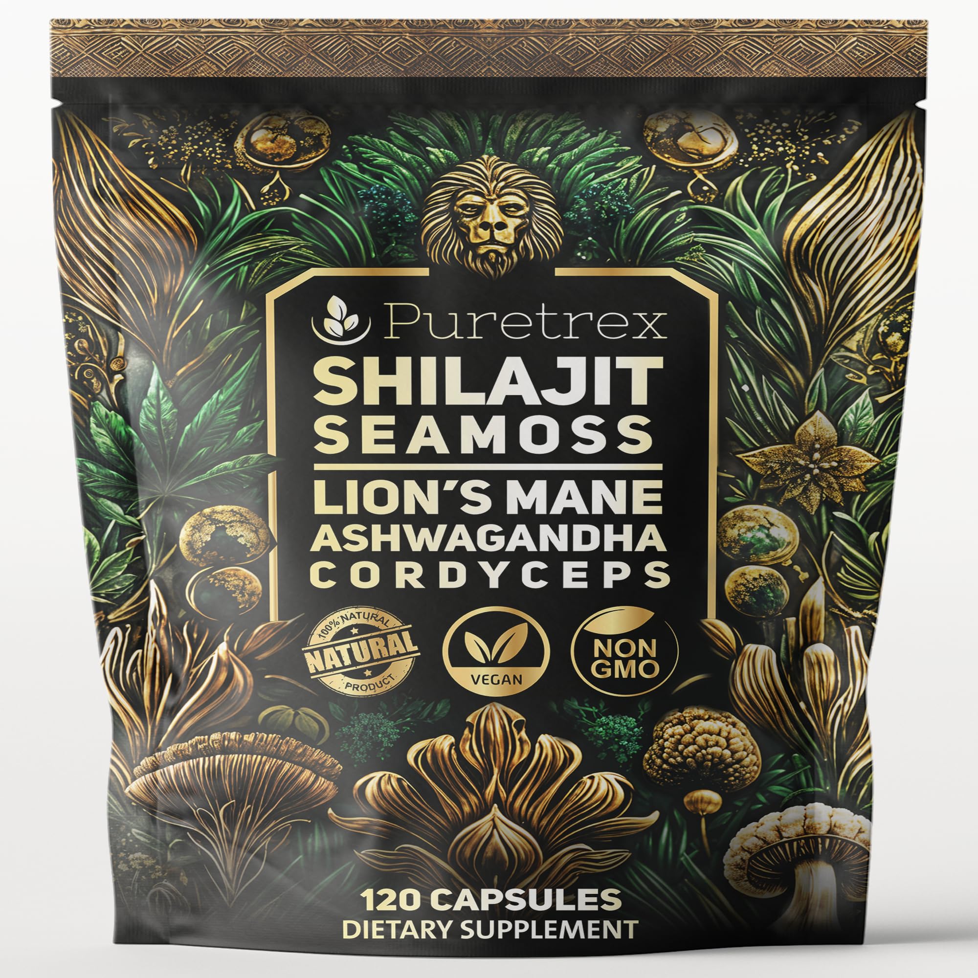 PURETREX Shilajit Seamoss Capsules with Lion's Mane, Ashwagandha, and Cordyceps 120 Vegan Capsules for Energy, Focus, and Wellness