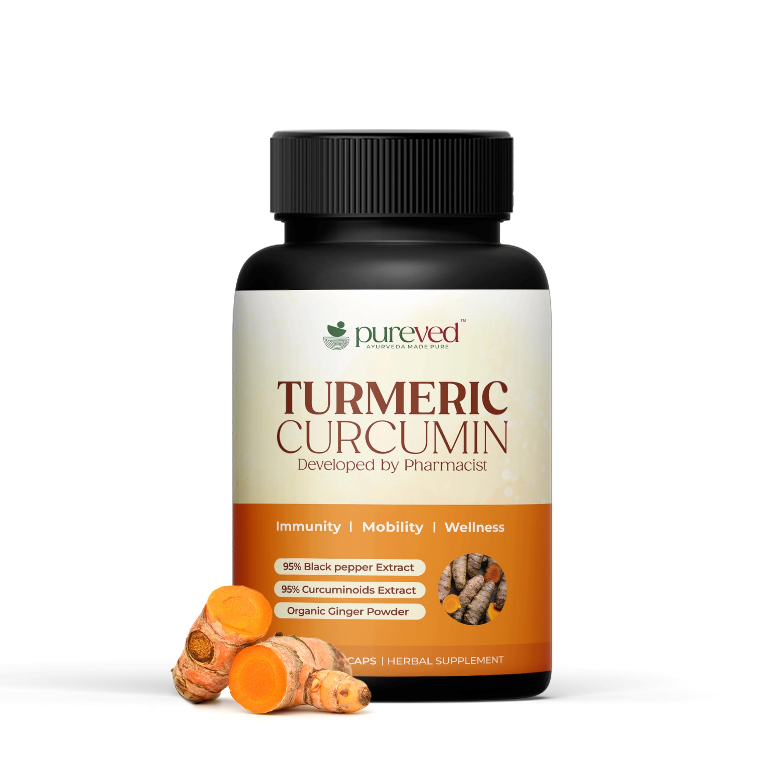 Pureved Turmeric Curcumin 90 Veg Capsules with Black Pepper and Ginger for Better Absorption | 100% Pure & Natural | Made in India