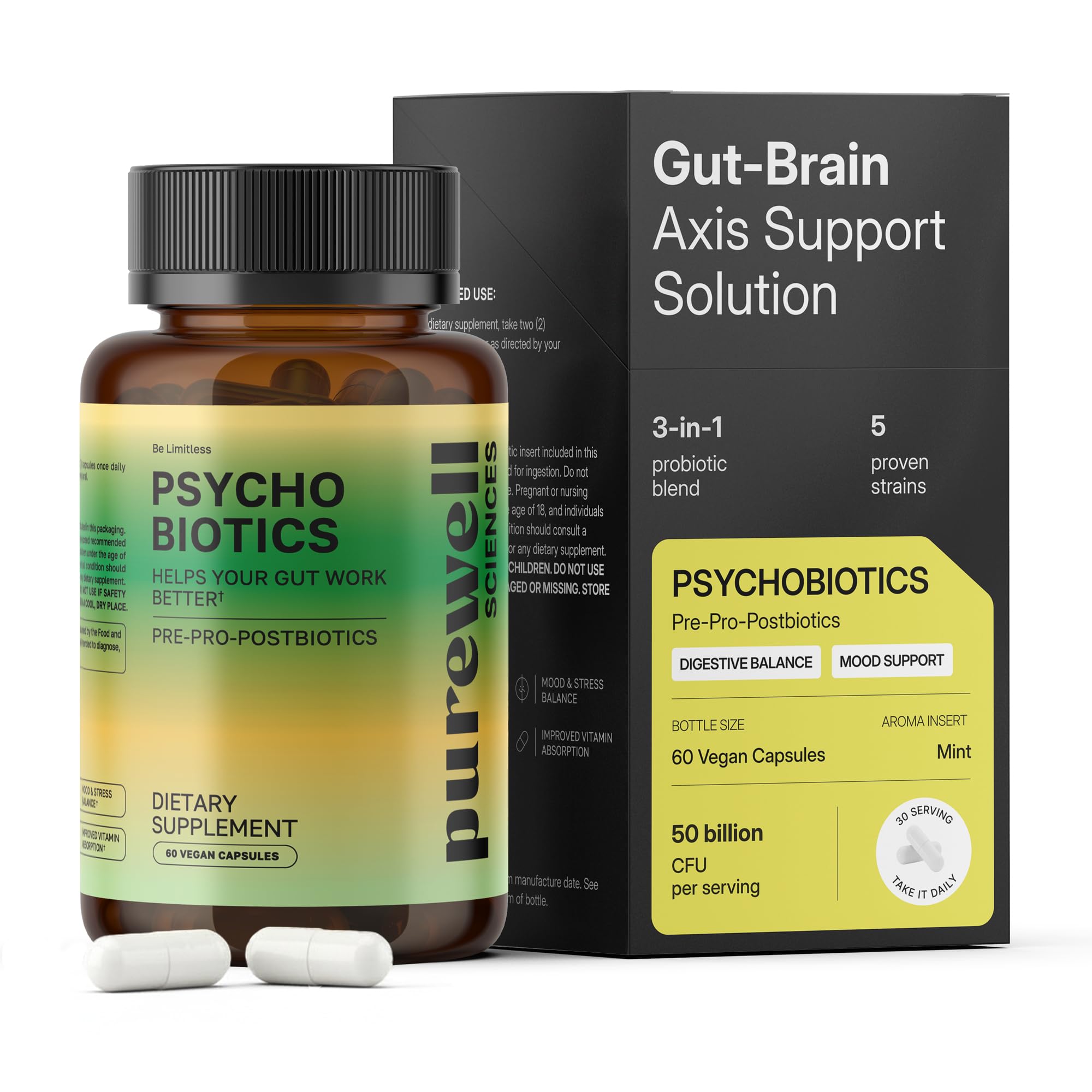 PUREWELL SCIENCES Psychobiotics Advanced 3-in-1 Probiotic Prebiotic Postbiotic Supplement for Gut and Mood Support - 60 Vegan Probiotic Capsules 50 Billion CFU 1-Month Supply