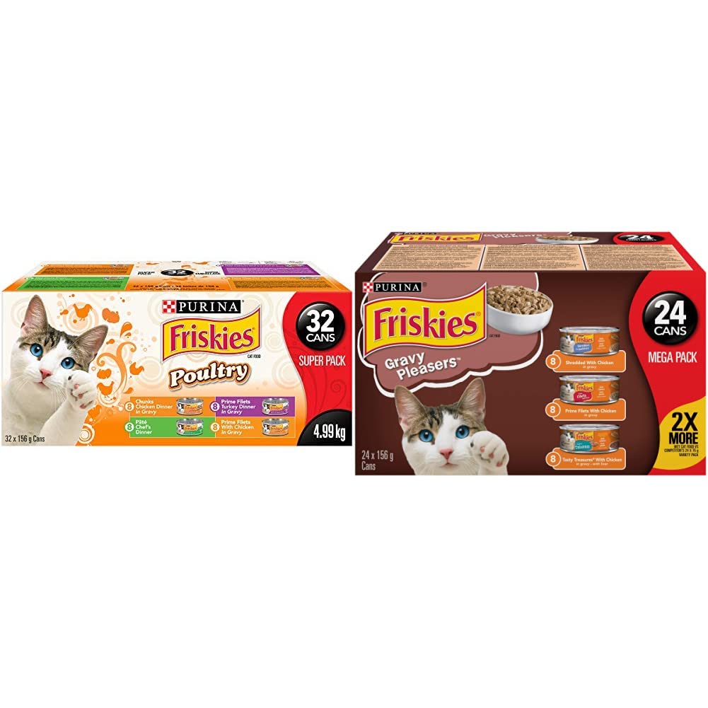 Wide variety of flavors and formats to satisfy your cat's preferences (Purina Friskies Poultry Super Pack). Offers a tempting assortment of your cat's favorite poultry flavors, inviting them to eagerly anticipate mealtime every day (Friskies Gravy Pleasures). Includes 32 cans of 156g each from the Purina Friskies Poultry Super Pack and 24 cans of 156g each from the Friskies Gravy Pleasures Variety Pack. Crafted with real meat or seafood in irresistible aromas and appealing textures to meet your cat's needs (Purina Friskies Poultry Super Pack). Provides 100% complete and balanced nutrition for adult cats with a variety of gourmet poultry entrees and gravy pleasures (Friskies Gravy Pleasures).