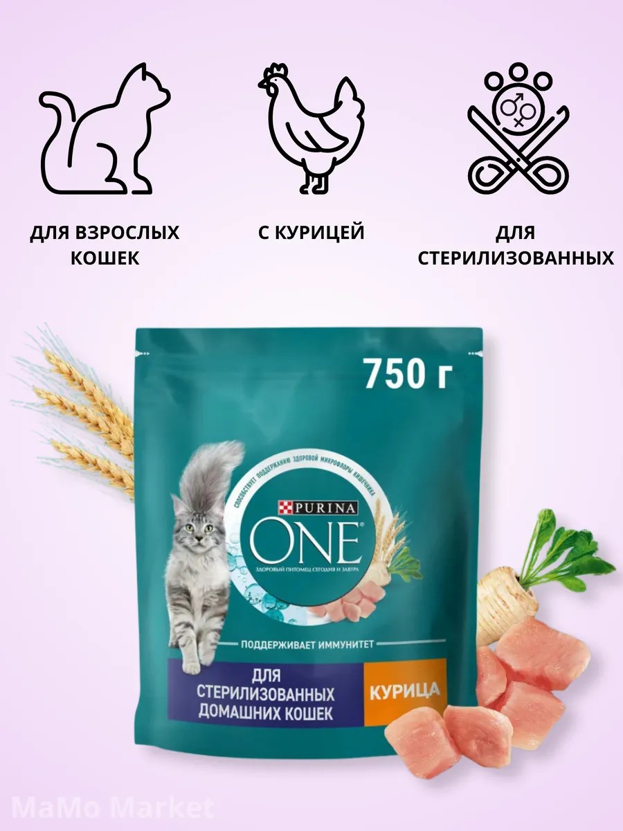 Товар . Сухой корм Purina ONE для стерилизованных домашних кошек с курицей 0.75 кг. Пурина для кошек разработан специально для стерилизованных кошек и кастрированных котов, живущих в домашних условиях. Поддержание здоровой микрофлоры кишечника имеет важное значение для здоровья Вашей кошки. Баланс микрофлоры кишечника напрямую влияет на состояние иммунной системы. Микрофлора - это экосистема, состоящая из триллионов микроорганизмов, обитающих в кишечнике - они уникальны для каждой кошки. Баланс микроорганизмов важен для поддержания здоровья пищеварительной системы, иммунитета и общего тонуса кошки. Корм Purina ONE - это обогащенная формула, которая содержит высококачественные ингредиенты, включая пребиотик - цикорий, способствующий улучшению состояния микрофлоры кишечника кошки и поддерживающий крепкое здоровье и иммунитет Вашего питомца. Корм сухой Пурина для кошек 750 г, благодаря балансу минеральных веществ мочевыделительная система кошки остается здоровой. Преимущества корма Purina для котов: Кошачий Корм Пурина способствует поддержанию здорового веса благодаря более высокому содержанию белка по отношению к содержанию жира; Здоровая мочевыделительная система благодаря балансу минеральных веществ; Сухой корм для кошек Purina one 750 г. содержит незаменимые жирные кислоты Омега 3 и 6 и поддерживает иммунитет; Доказанное снижение образование зубного камня до 40% благодаря особой текстуре гранул; Клетчатка и естественный пребиотик корня цикория благотворно действуют на пищеварение; Высокая усвояемость благодаря высококачественным ингредиентам; Корм для стерилизованных кошек Purina One, не содержит искусственных красителей, ароматизаторов и консервантов. Сухой корм для котов Purina для кошек, готов к употреблению. Рекомендуемая суточная норма указана на упаковке.