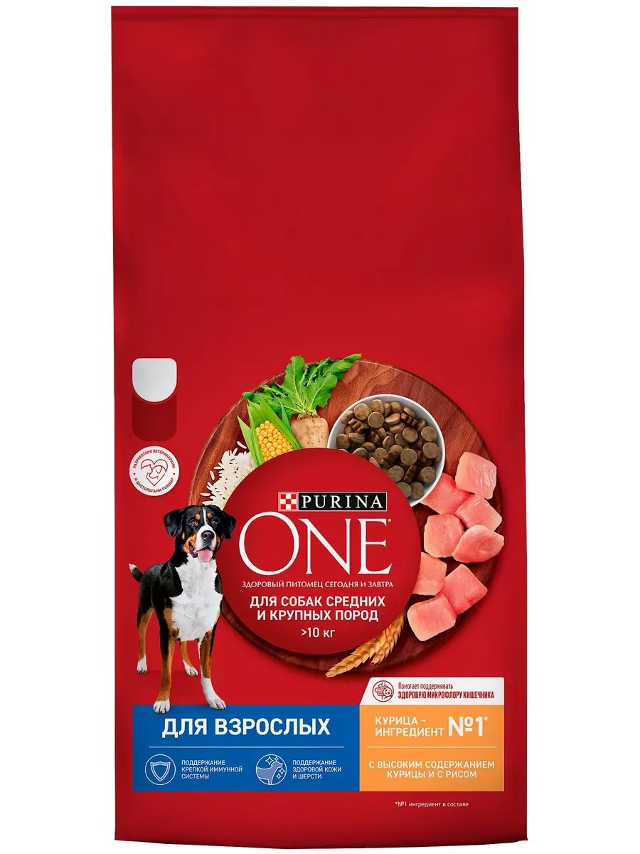 Корм Purina One для собак средних и крупных пород, с курицей и рисом, 10 кг. Корм Purina One для собак средних и крупных пород, с курицей и рисомСобакам крупных пород нужно много энергии, чтобы поддерживать мощный организм в оптимальном состоянии. Однако для взрослых питомцев характерно снижение подвижности с годами, что может привести к набору лишнего веса и сопутствующим заболеваниям. Разрабатывая сухие корма высокого качества, эксперты Purina One создали особый рацион для Вашего питомца с учетом его особых потребностейСухой корм для собак Purina One полнорационный, содержит необходимые для здоровья микронутриенты.Высокое содержание легкого в усвоении животного белка высокого качества в сочетании с растительным белком обеспечивает энергией и помогает поддерживать оптимальный вес.Благодаря текстуре гранул корм для собак Purina ONE предупреждает образование зубного камня.Незаменимые жирные кислоты Омега 3 и Омега 6 поддерживают здоровье кожи и шерсти.Аминокислоты и антиоксиданты укрепляют иммунную системуКлетчатка благотворно влияет на пищеварение.Говядина, курица или ягненок высокого качества - источник белка и отличного вкуса.Состав: курица (17%*), пшеница (15,5%), кукуруза, сухой белок птицы, пшеничный глютен, животный жир, кукурузная крупа, высушенная мякоть свеклы, рис (4%), гидролизат белков животного происхождения, минеральные вещества, пропиленгликоль, яичный порошок, рыбий жир, солодовая мука, витамины, L-цистеин, антиоксиданты.*Курица 17%, из которых мин. 5% мясо птицы.Гарантированные показатели: белок: 25%, содержание жира: 15%, сырая зола: 7,0%, сырая клетчатка: 2,5%, Омега-3 жирные кислоты: 0,3%, Омега-6 жирные кислоты: 2,1%.Добавленные вещества: МЕ/кг: витамин А: 16 200; витамин Д3: 520; витамин E: 540; мг/кг: витамин C: 140; железо: 78; йод: 2,0; медь: 12; марганец: 36; цинк: 120; селен: 0,11.Условия хранения: хранить в сухом прохладном месте. Упаковка не предназначена для игры.