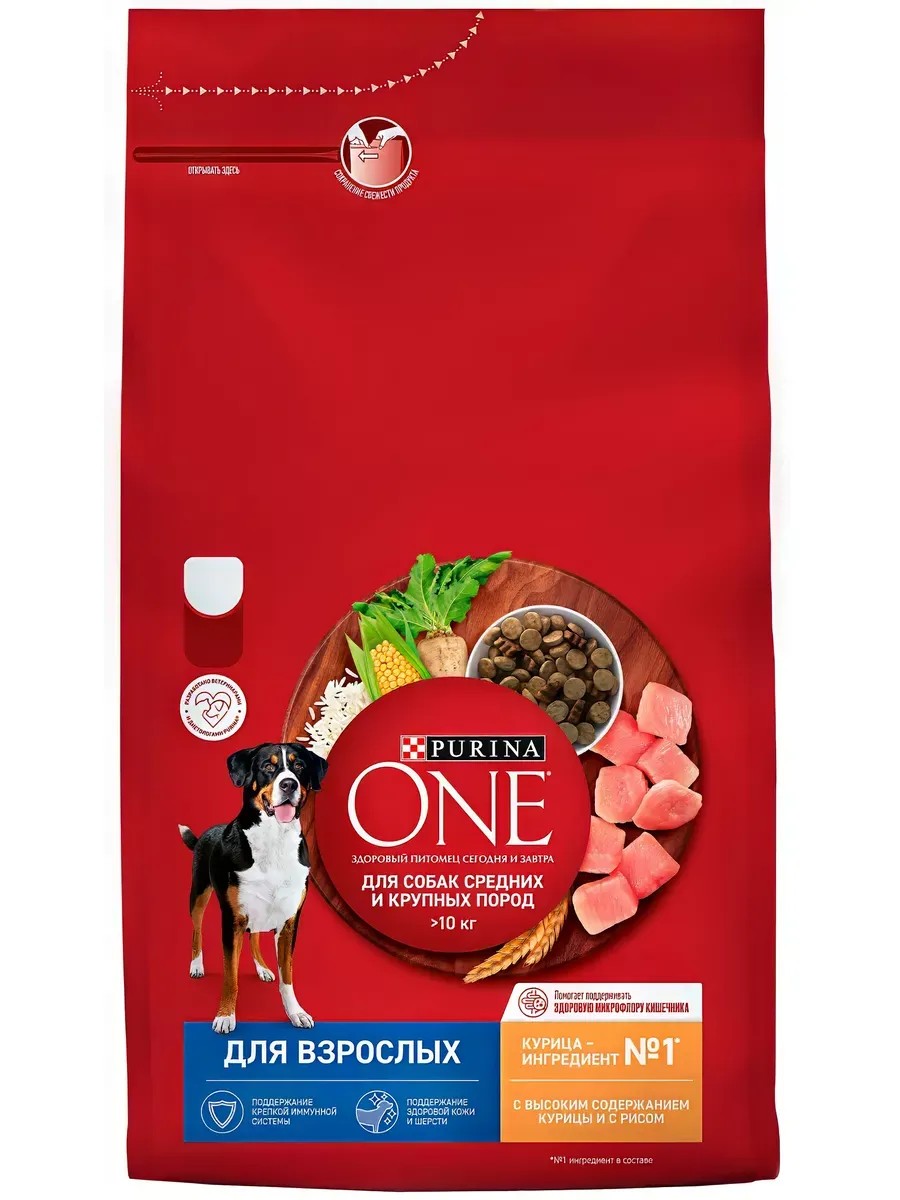 Корм Purina One для собак средних и крупных пород, с курицей и рисом, 3.8 кг. Корм Purina One для собак средних и крупных пород, с курицей и рисомСобакам крупных пород нужно много энергии, чтобы поддерживать мощный организм в оптимальном состоянии. Однако для взрослых питомцев характерно снижение подвижности с годами, что может привести к набору лишнего веса и сопутствующим заболеваниям. Разрабатывая сухие корма высокого качества, эксперты Purina One создали особый рацион для Вашего питомца с учетом его особых потребностейСухой корм для собак Purina One полнорационный, содержит необходимые для здоровья микронутриенты.Высокое содержание легкого в усвоении животного белка высокого качества в сочетании с растительным белком обеспечивает энергией и помогает поддерживать оптимальный вес.Благодаря текстуре гранул корм для собак Purina ONE предупреждает образование зубного камня.Незаменимые жирные кислоты Омега 3 и Омега 6 поддерживают здоровье кожи и шерсти.Аминокислоты и антиоксиданты укрепляют иммунную системуКлетчатка благотворно влияет на пищеварение.Говядина, курица или ягненок высокого качества - источник белка и отличного вкуса.Состав: курица (17%*), пшеница (15,5%), кукуруза, сухой белок птицы, пшеничный глютен, животный жир, кукурузная крупа, высушенная мякоть свеклы, рис (4%), гидролизат белков животного происхождения, минеральные вещества, пропиленгликоль, яичный порошок, рыбий жир, солодовая мука, витамины, L-цистеин, антиоксиданты.*Курица 17%, из которых мин. 5% мясо птицы.Гарантированные показатели: белок: 25%, содержание жира: 15%, сырая зола: 7,0%, сырая клетчатка: 2,5%, Омега-3 жирные кислоты: 0,3%, Омега-6 жирные кислоты: 2,1%.Добавленные вещества: МЕ/кг: витамин А: 16 200; витамин Д3: 520; витамин E: 540; мг/кг: витамин C: 140; железо: 78; йод: 2,0; медь: 12; марганец: 36; цинк: 120; селен: 0,11.Условия хранения: хранить в сухом прохладном месте. Упаковка не предназначена для игры.