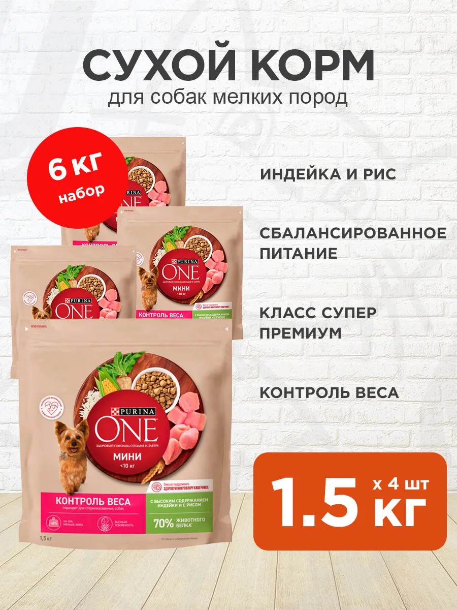 PURINA ONE Корм для собак сухой Мини Контроль веса индейка 1,5 кг 4 шт